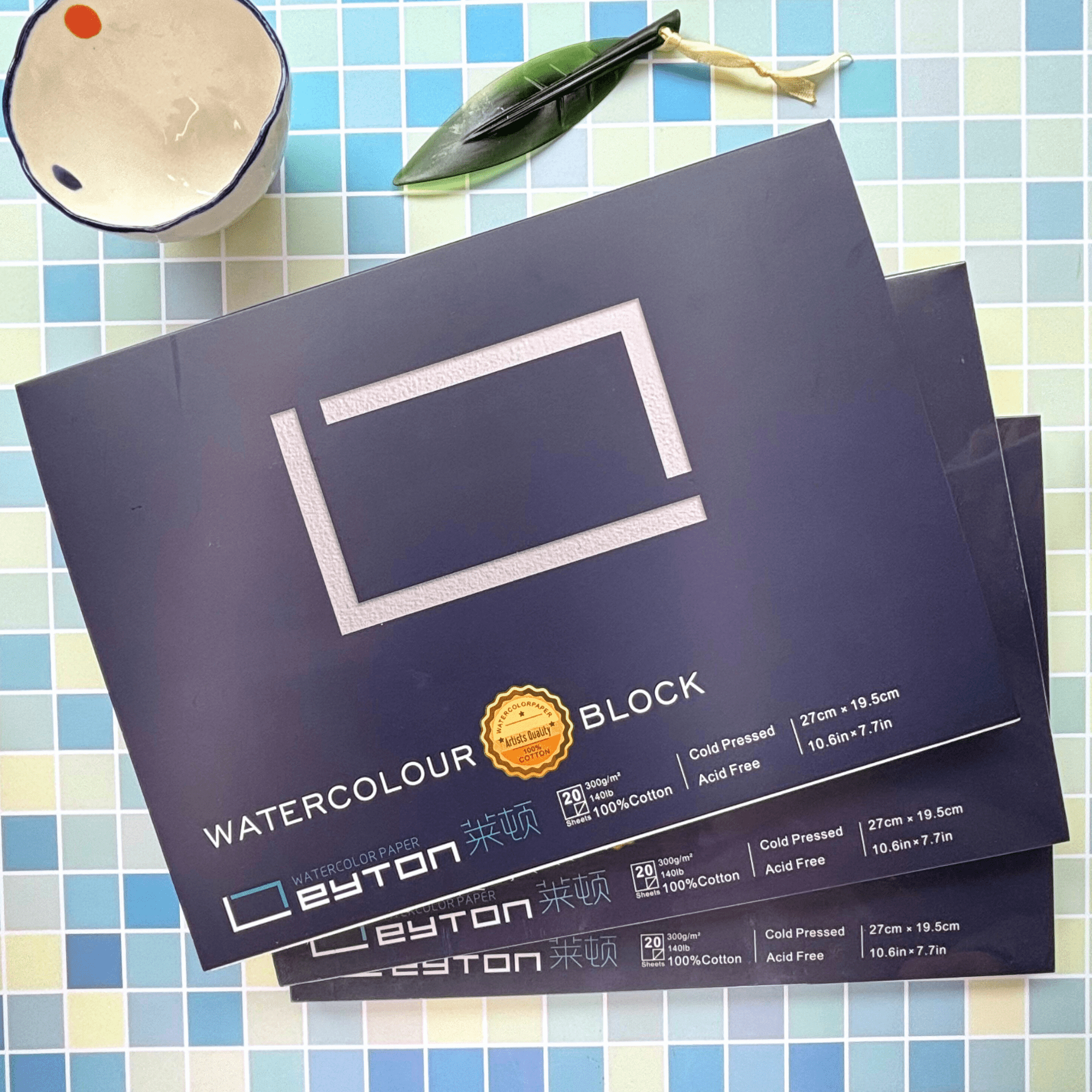 Bloc de papier d’aquarelle Leyton qualité artiste 100 % coton , 300g/m² (140lb) , Grain Fin, pressé à froid, 20 feuilles par bloc, non blanchi et sans acide, qualité artiste, se peint sur les deux faces.