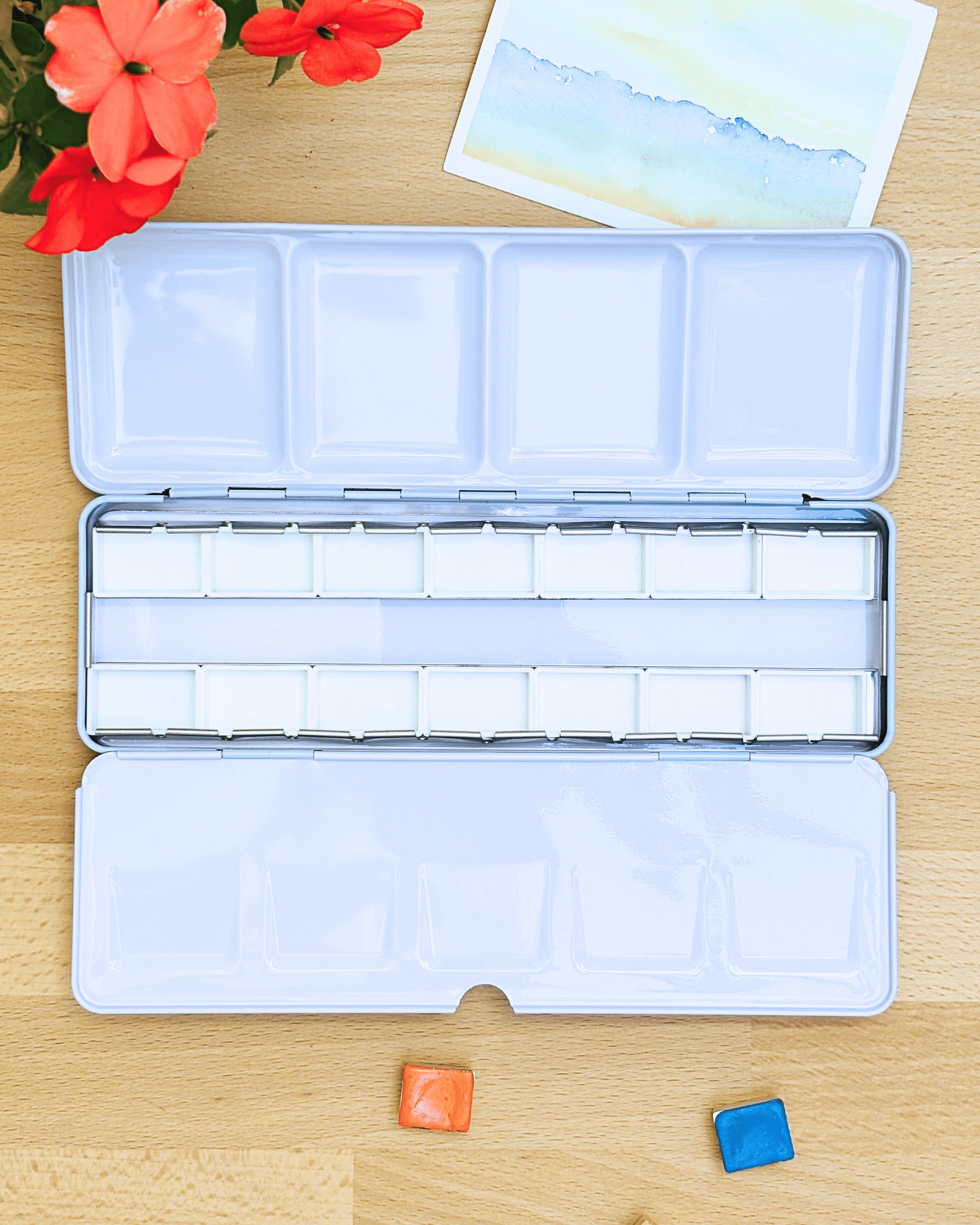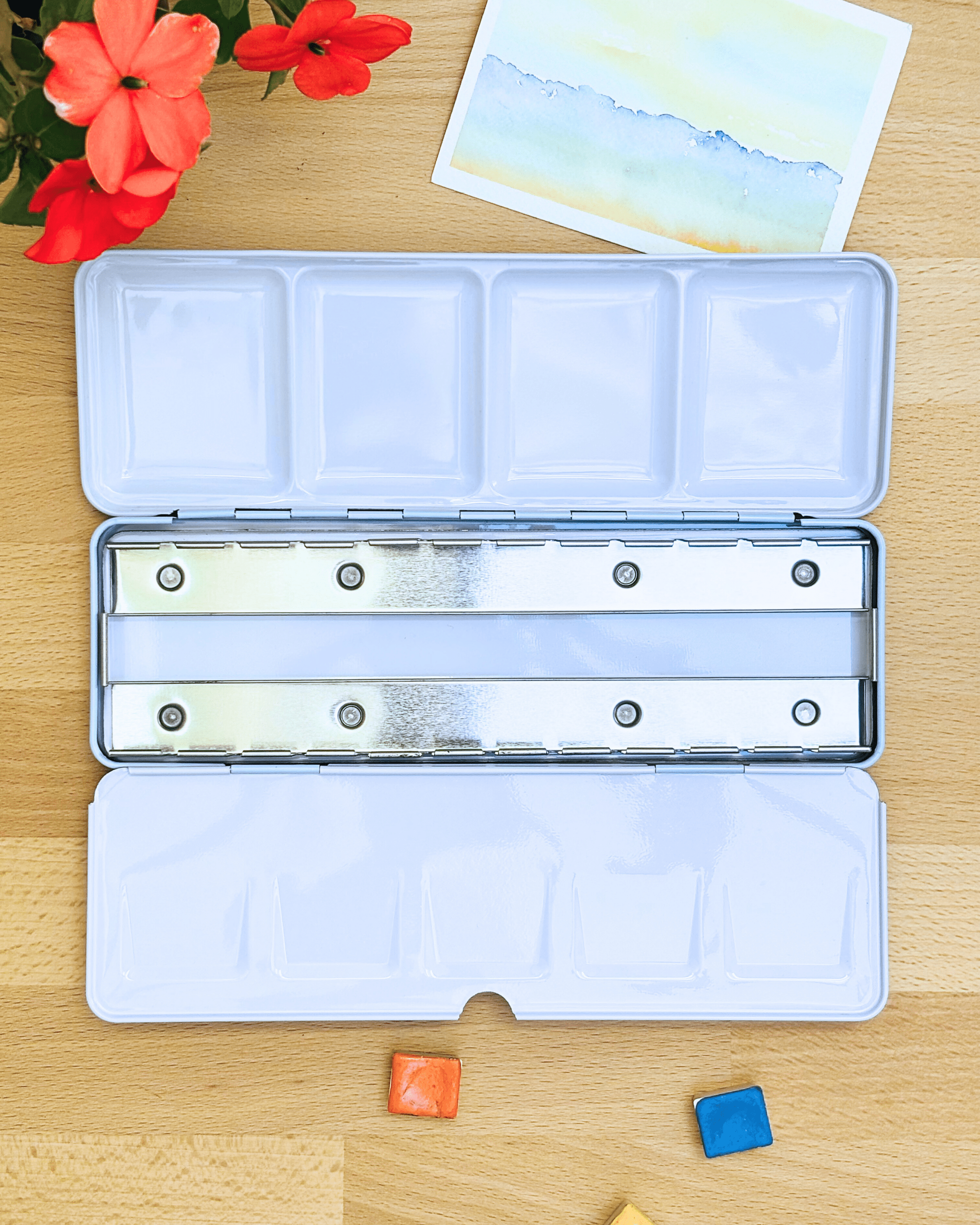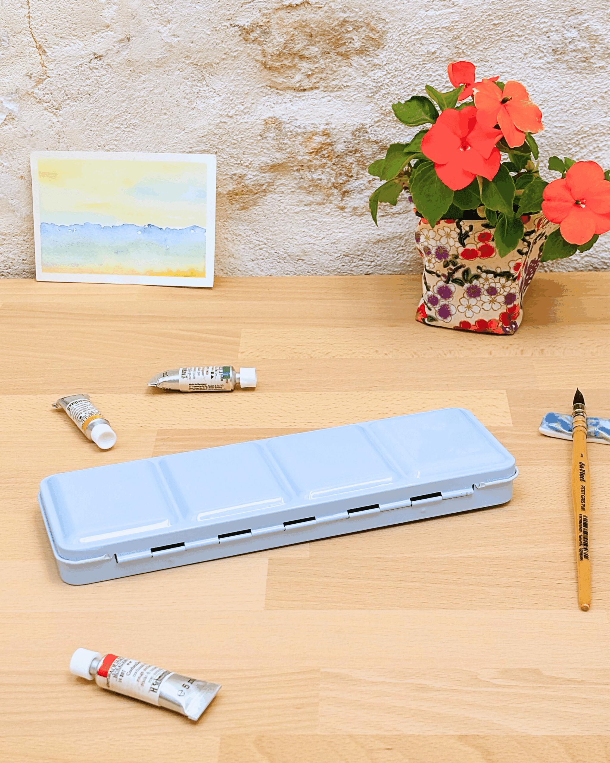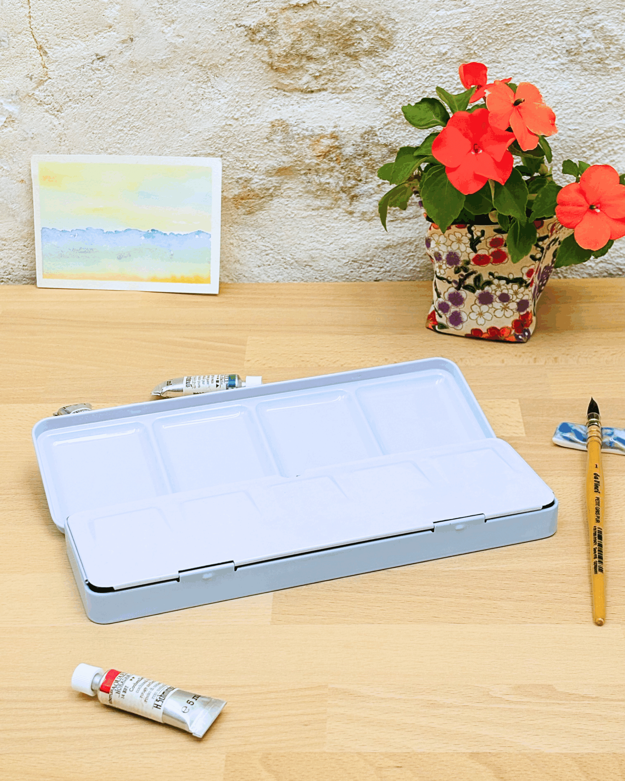 Personnalisez votre palette et rangez vos couleurs avec cette boîte d’aquarelle en métal émaillé.