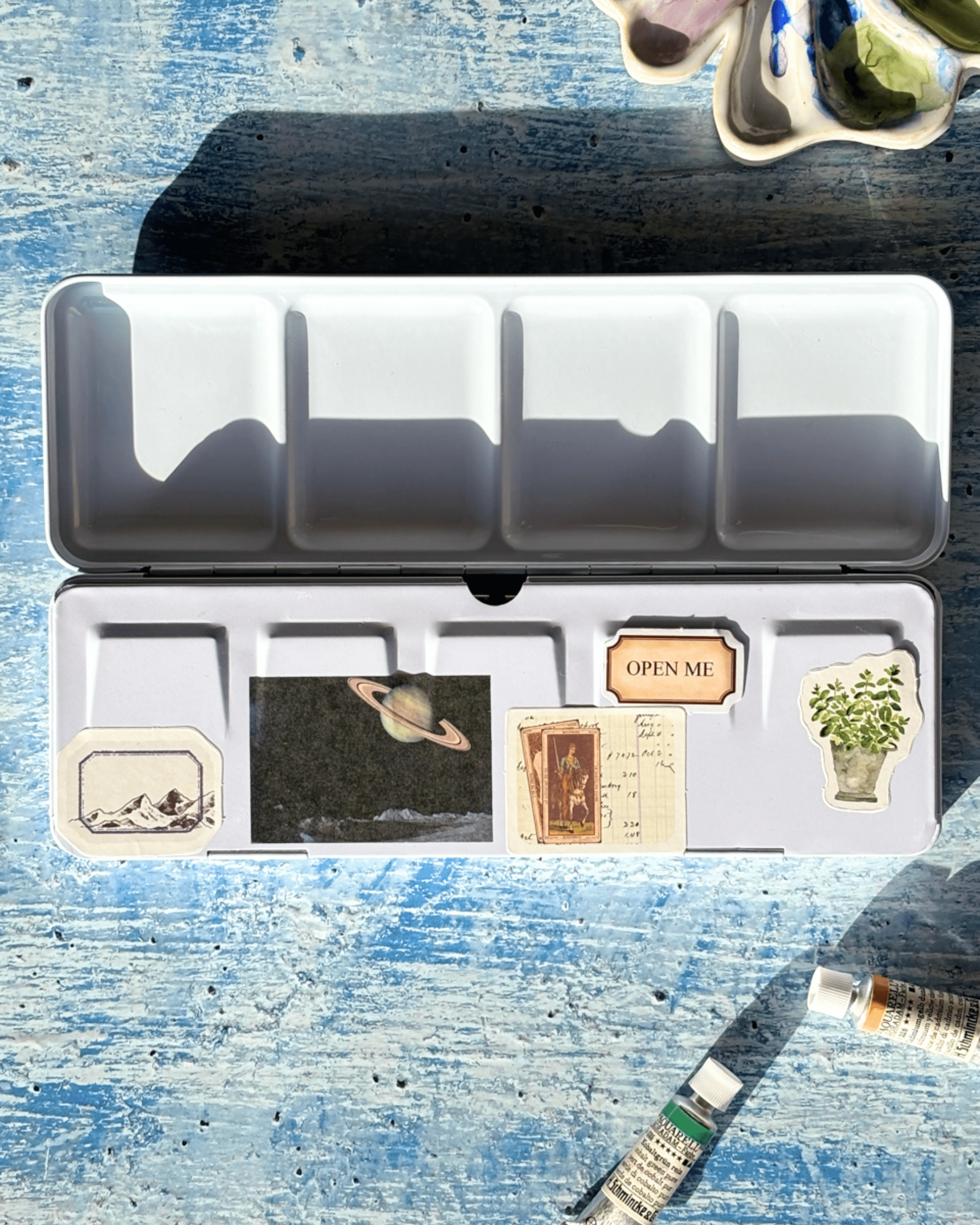 La boîte métallique contient deux palettes de peinture latérales pour mélanger les couleurs, avec 4 puits côté couvercle et 5 emplacement légèrement inclinés sur la palette intérieure. Une zone de mélange supplémentaire est disponible en retirant le plateau.