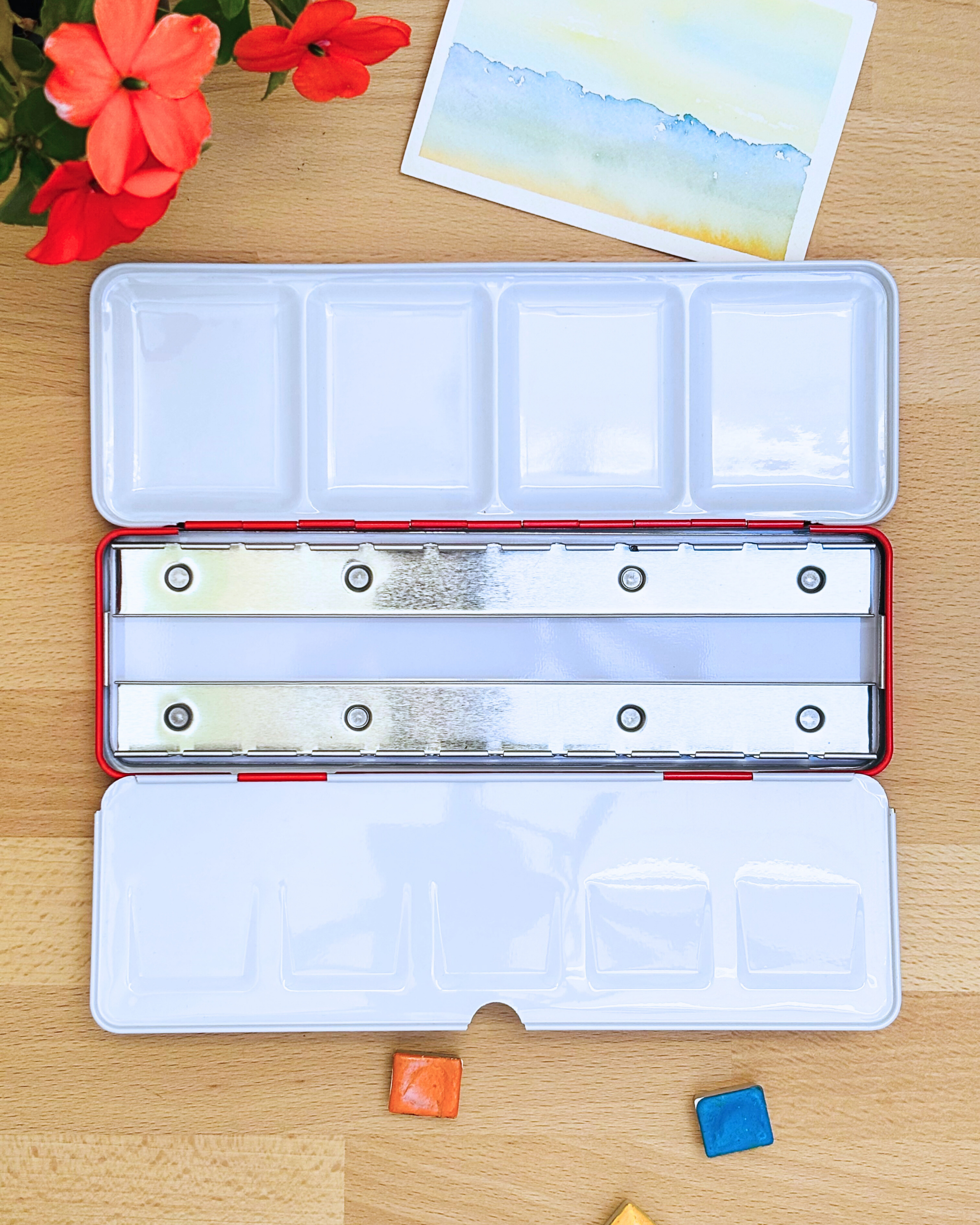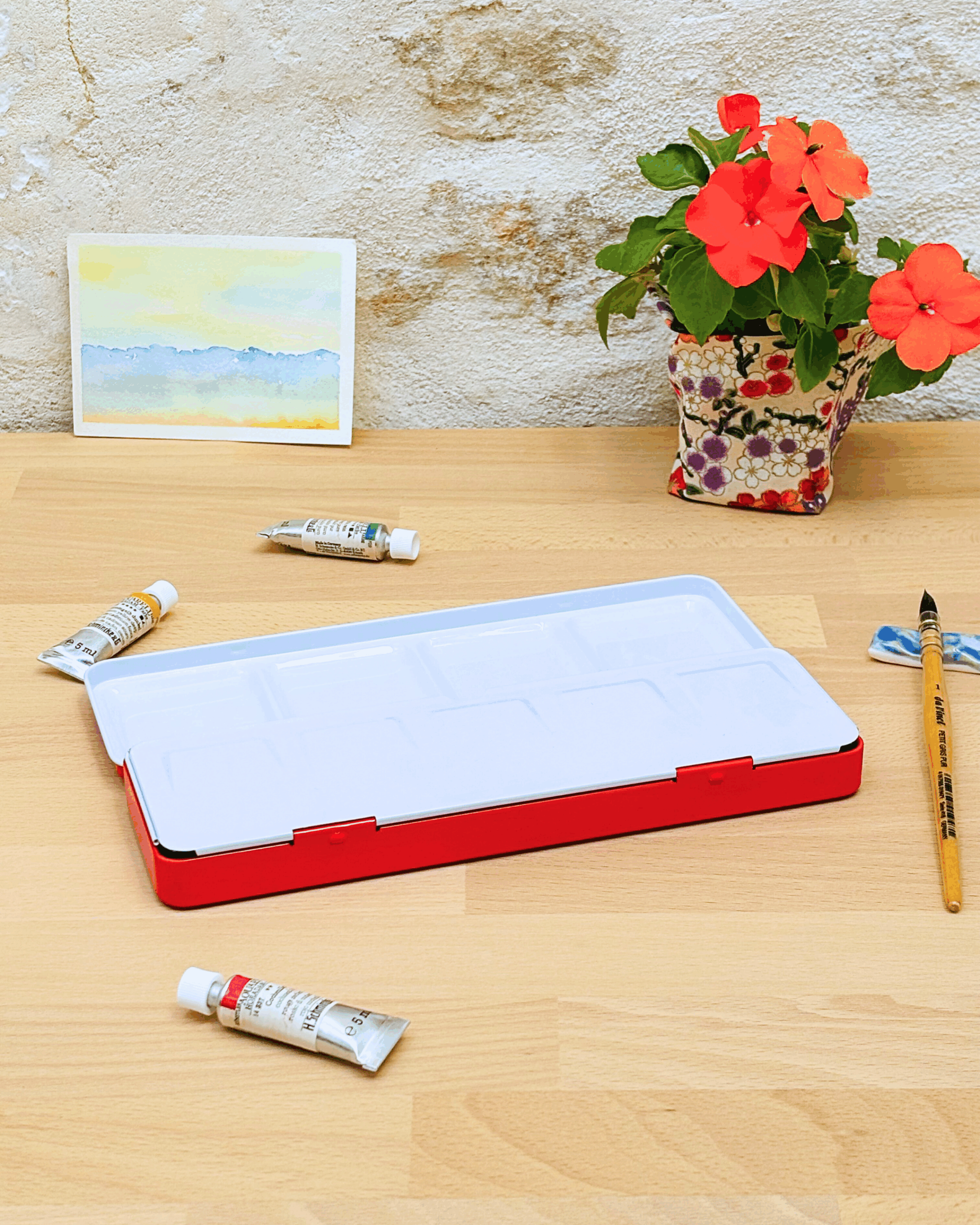 Personnalisez votre palette et rangez vos couleurs avec cette boîte d’aquarelle en métal émaillé.