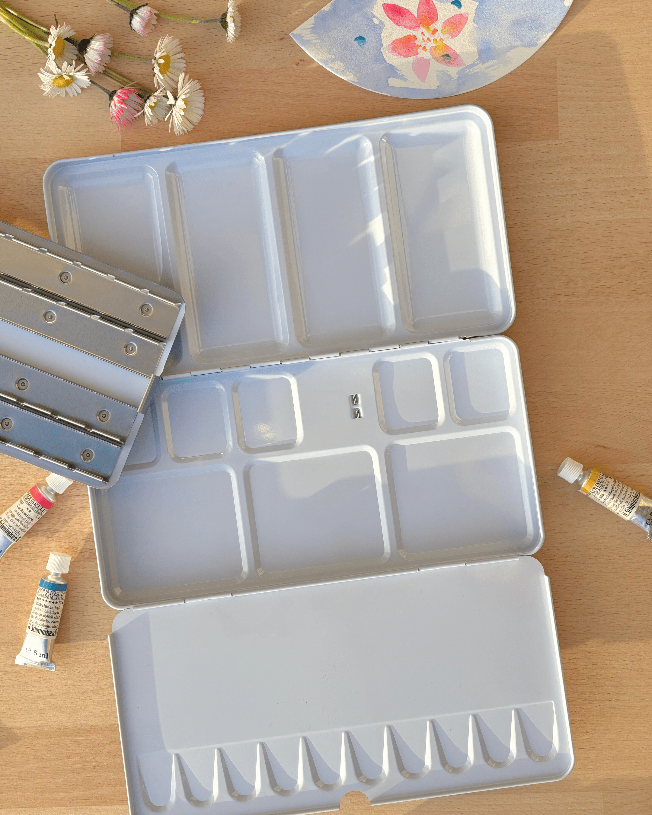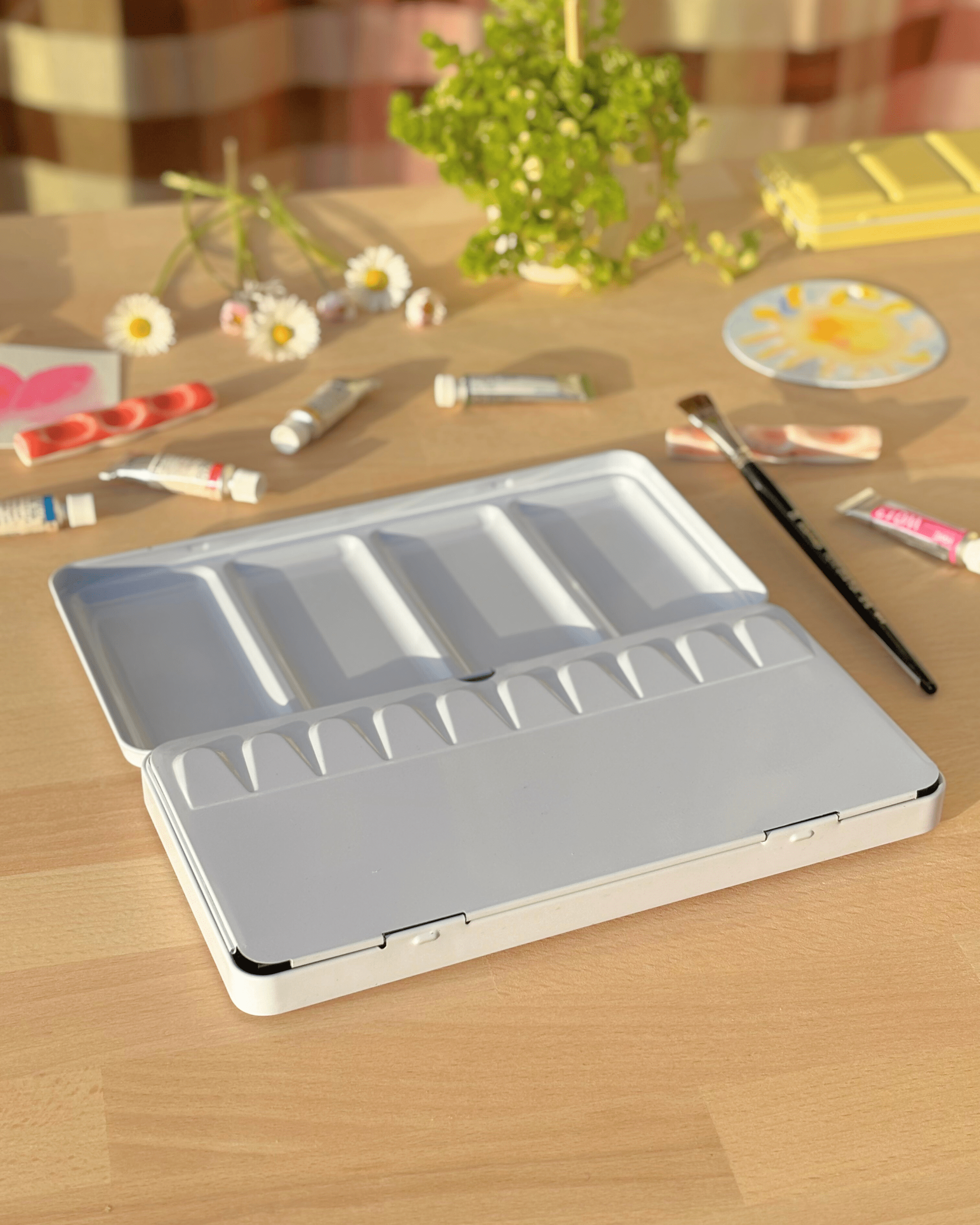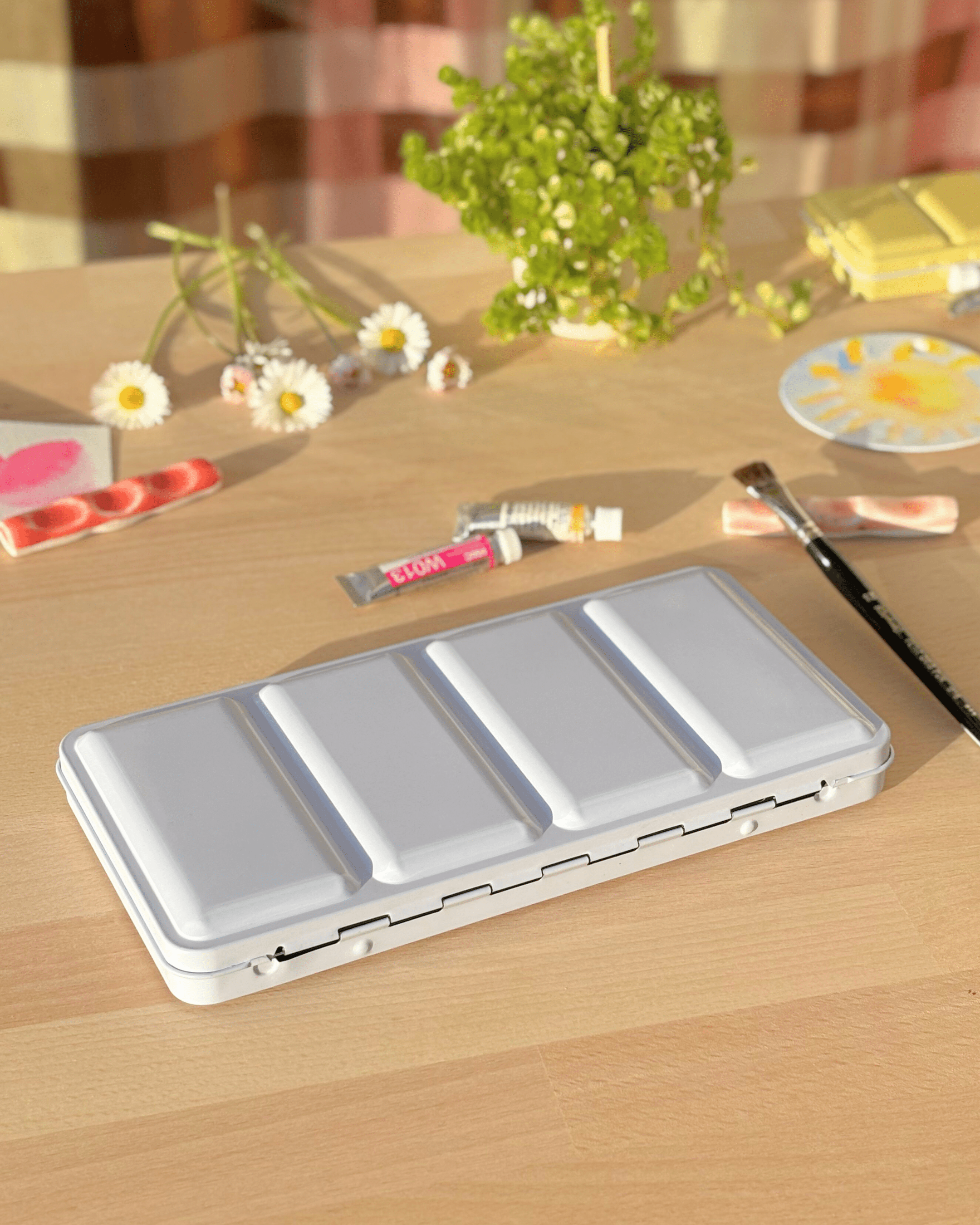 Personnalisez votre palette et rangez vos couleurs avec cette boîte d’aquarelle en métal émaillé.