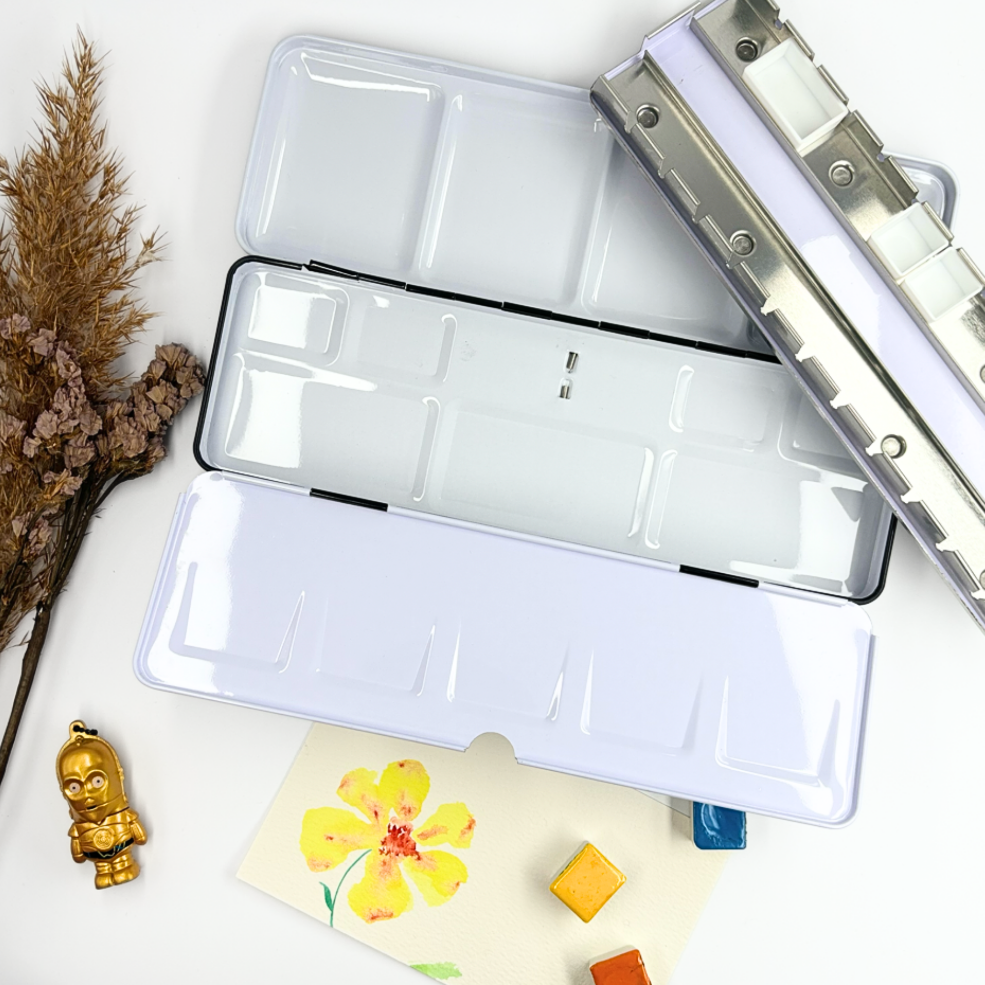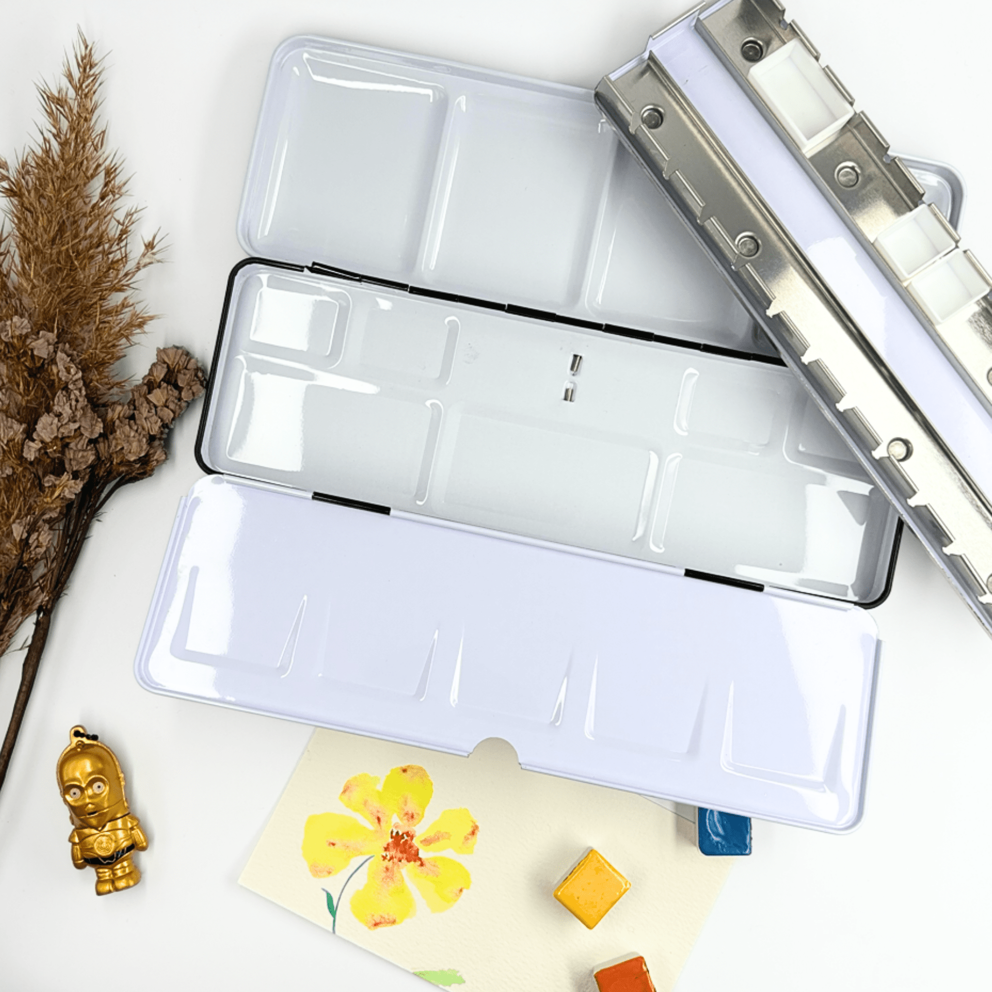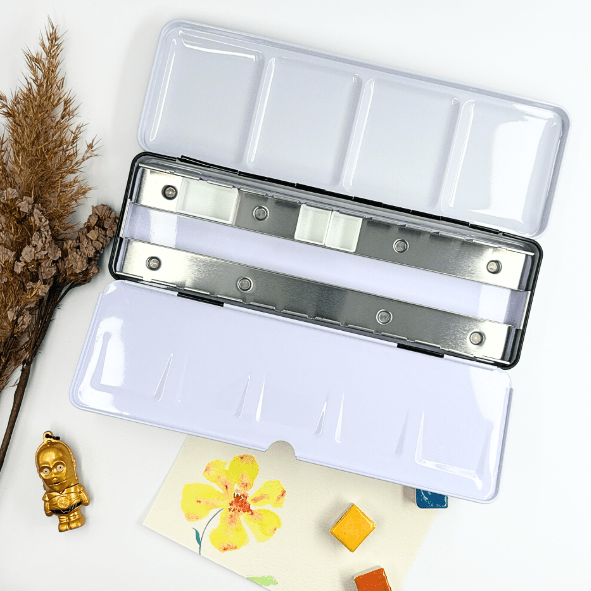 Personnalisez votre palette et rangez vos couleurs avec cette boîte d’aquarelle en métal émaillé.