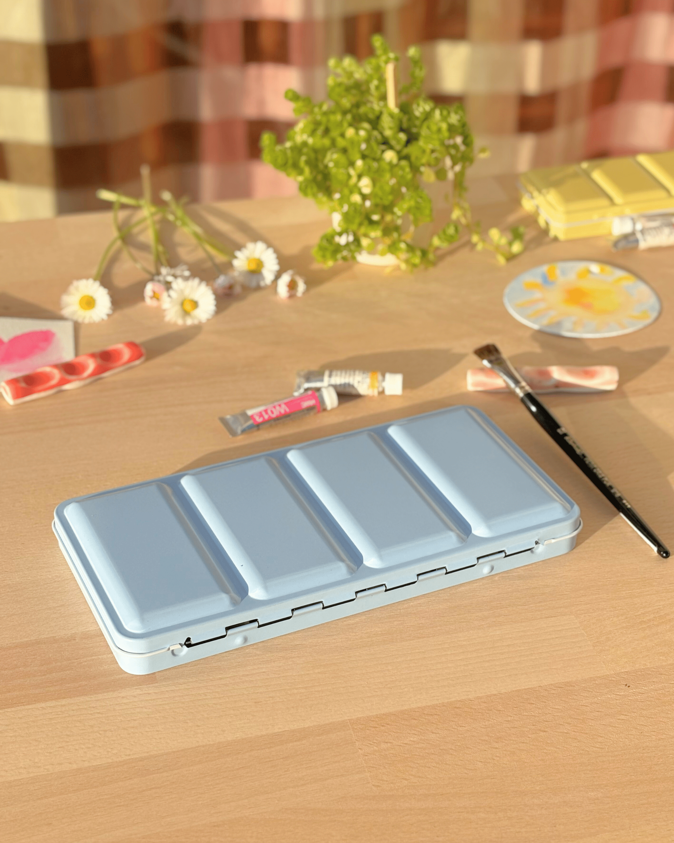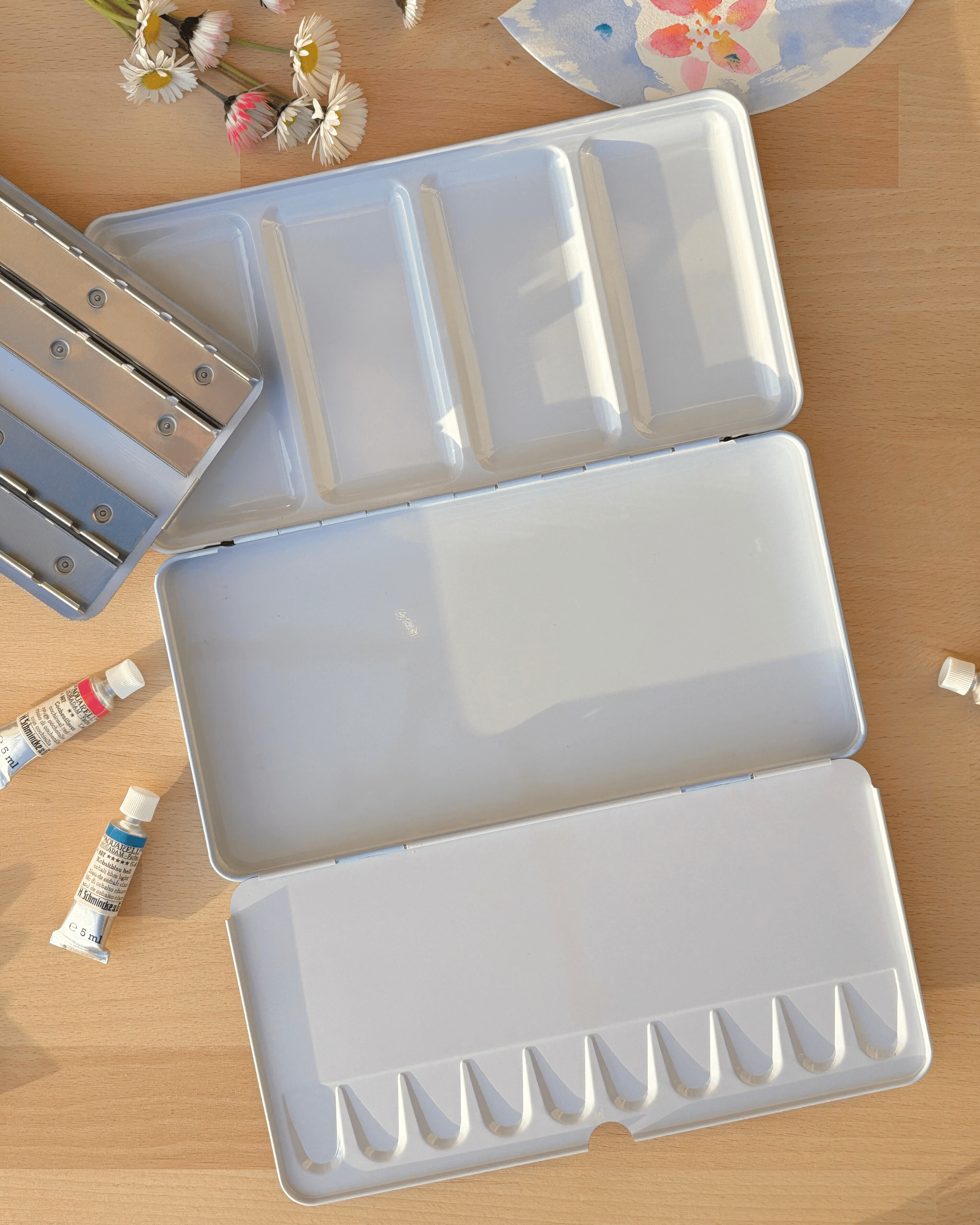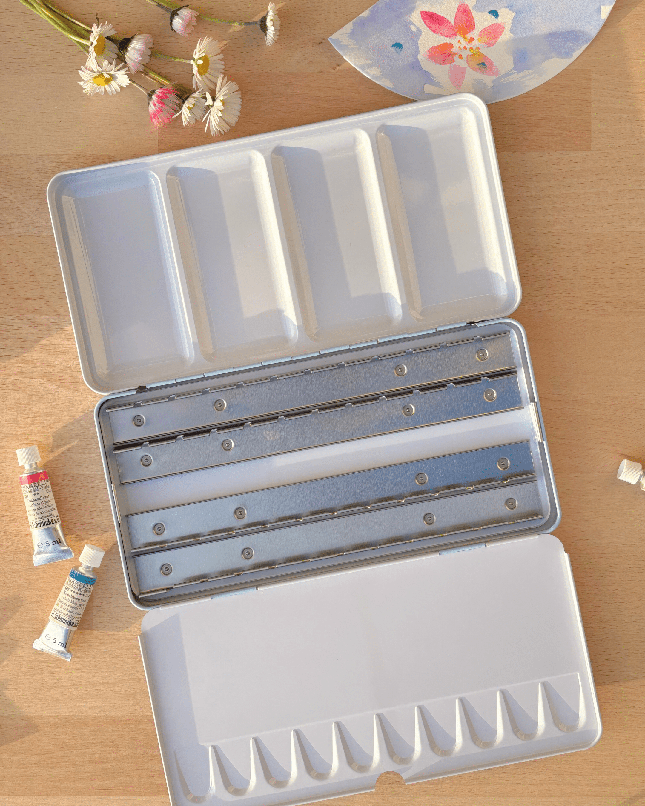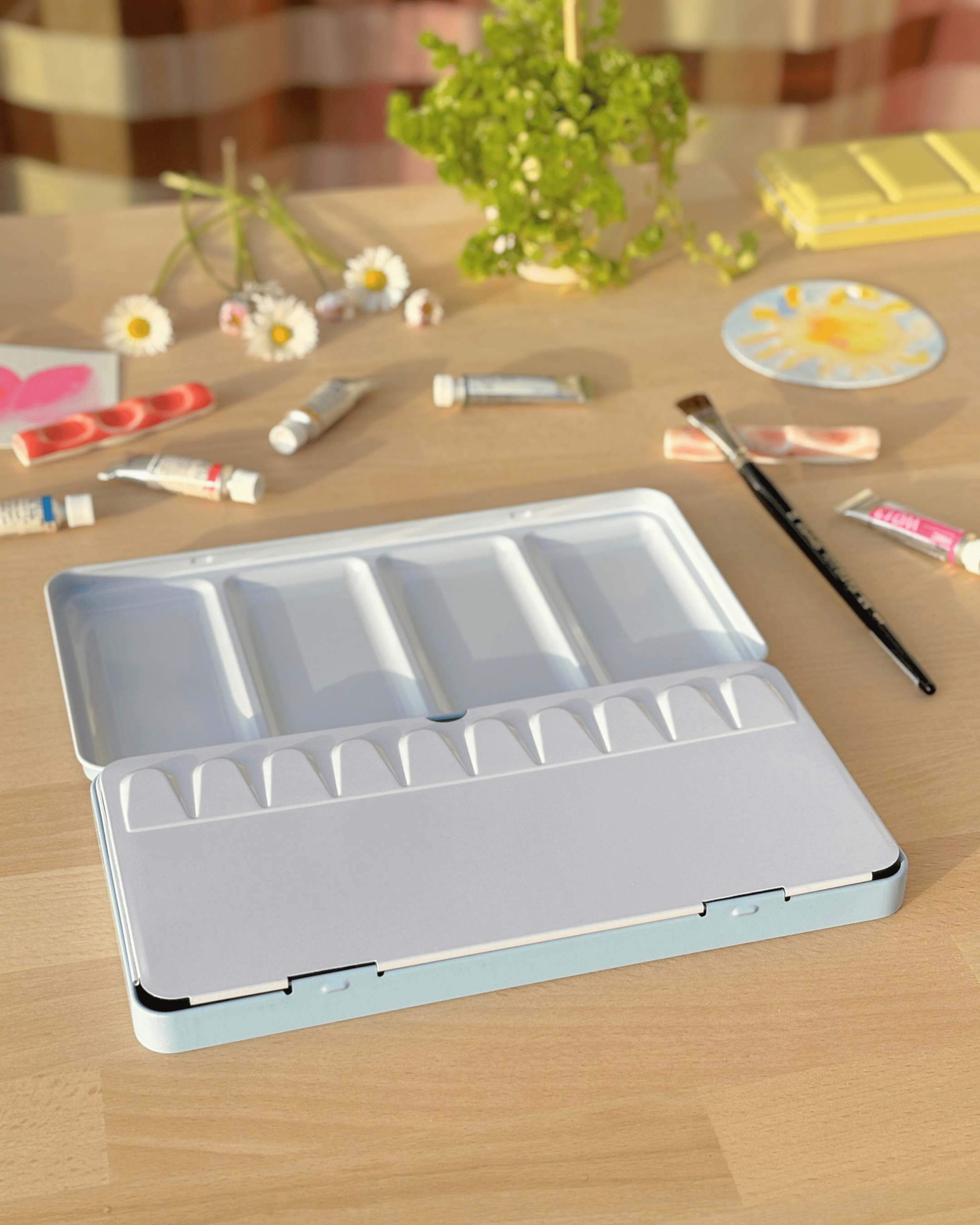 Personnalisez votre palette et rangez vos couleurs avec cette boîte d’aquarelle en métal émaillé.