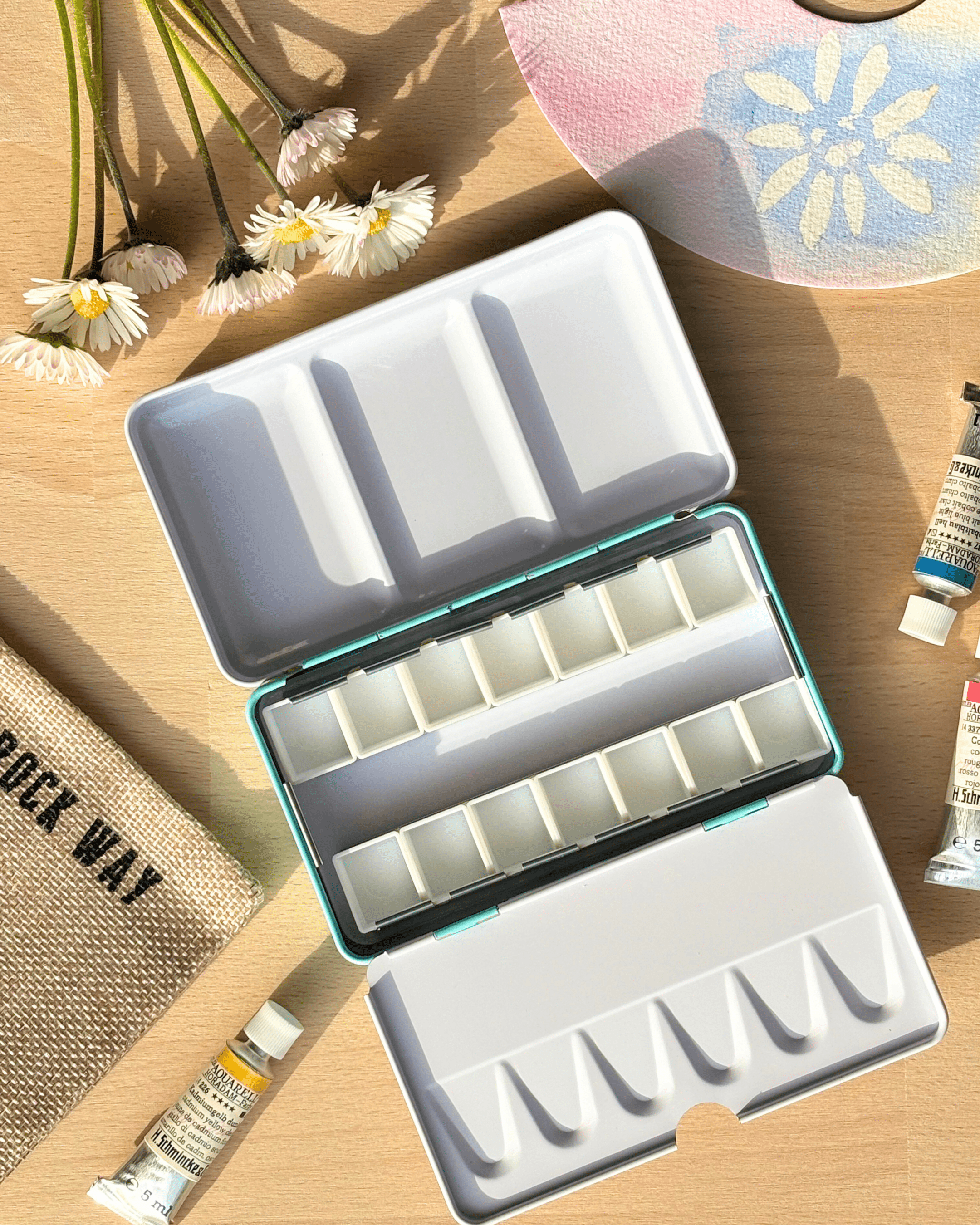 Modèle Boîte avec godets: personnalisez votre palette de couleurs de manière créative, utilisez vos tubes flambant neufs ou du fond du tiroir et remplissez les demi-godets vides de vos couleurs favorites et fétiches.