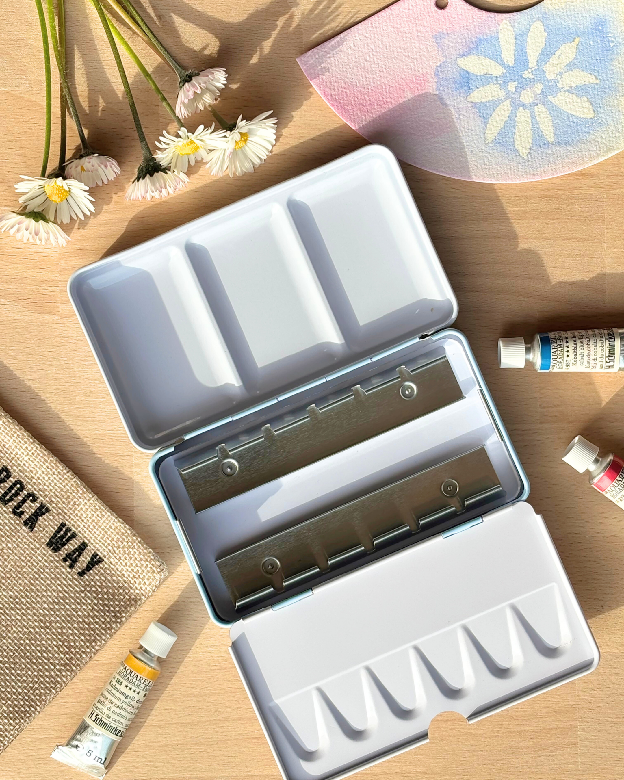 Un espace vide central entre les rails métalliques permet de ranger un pinceau de voyage ou 2 tubes de peinture de 5ml.