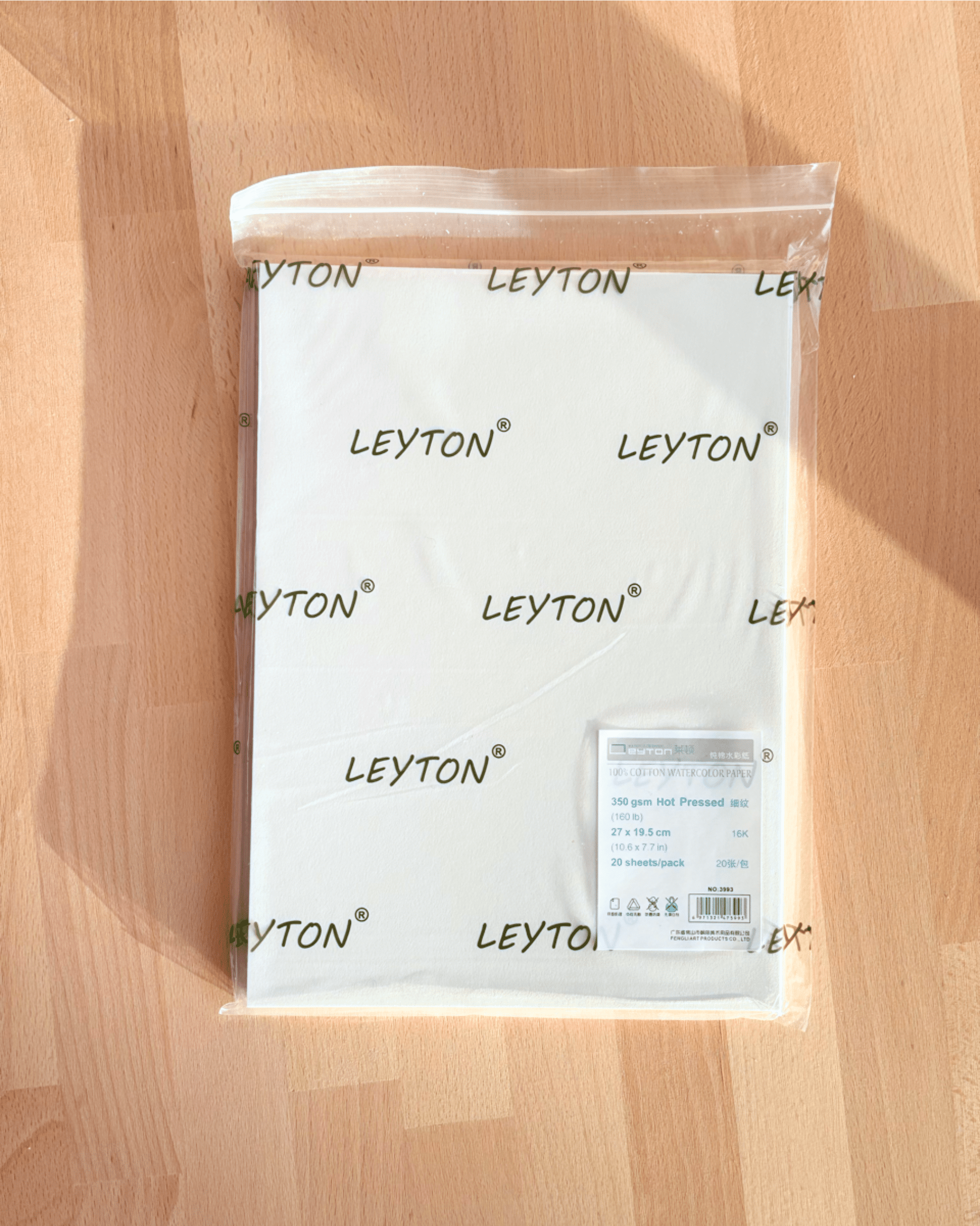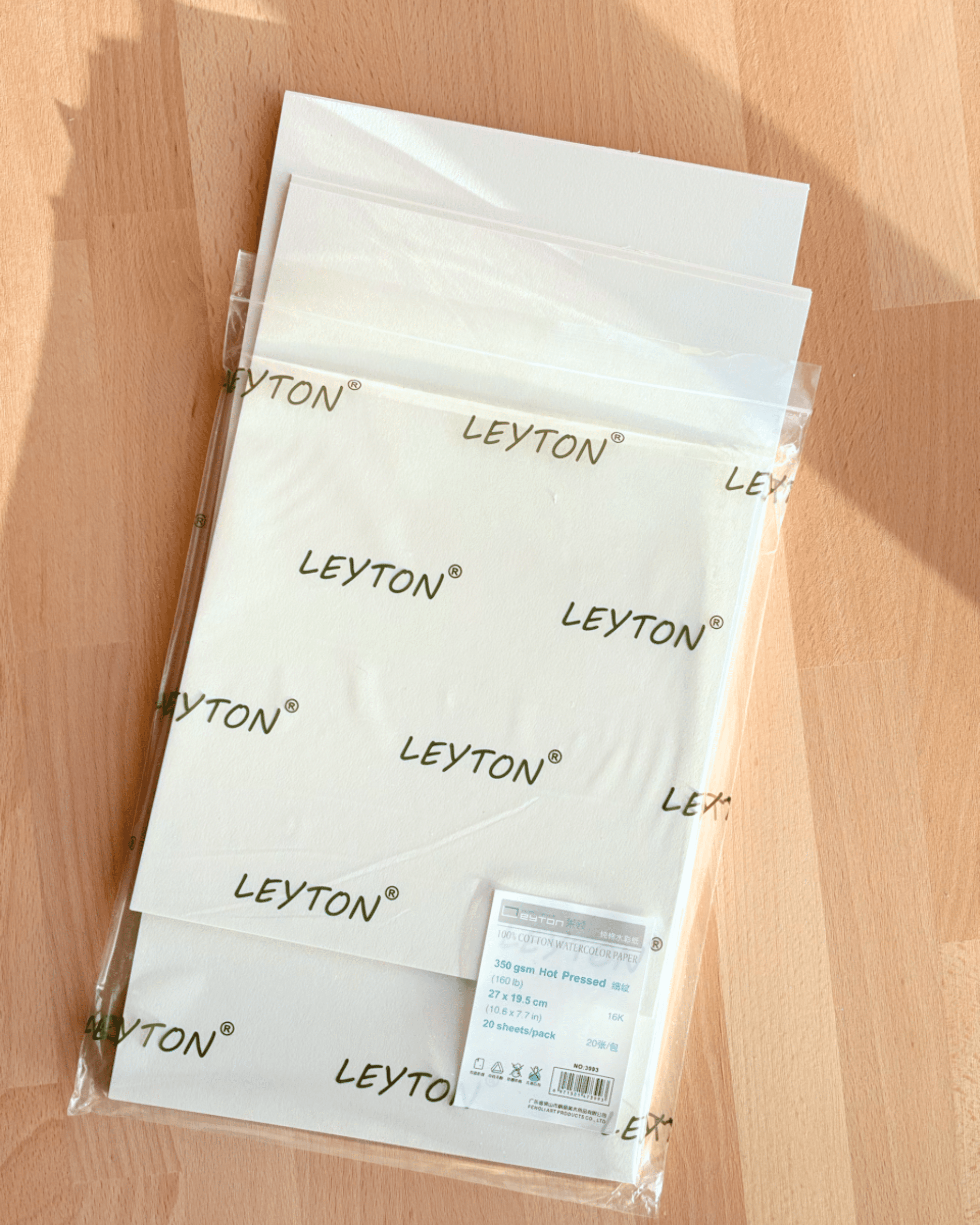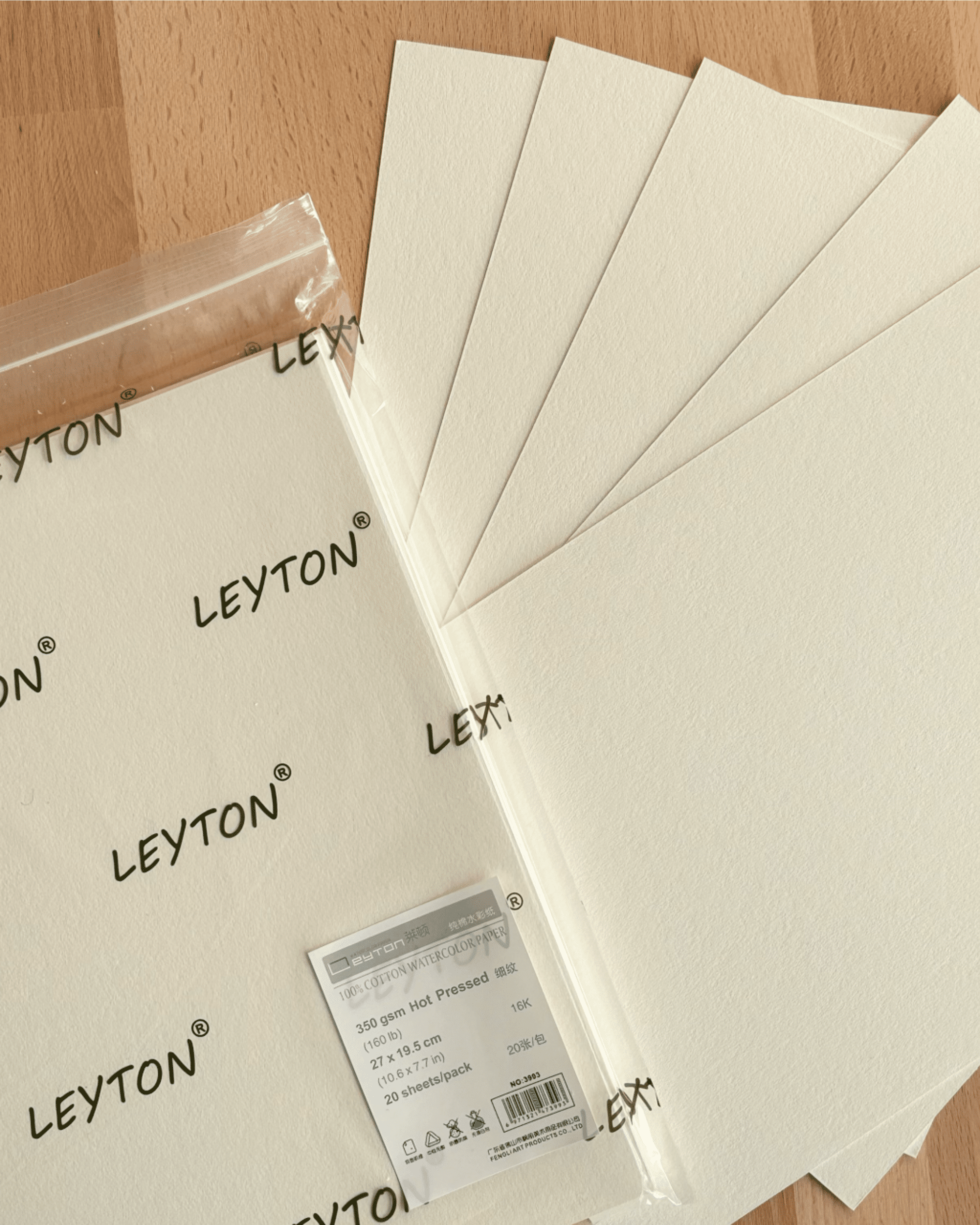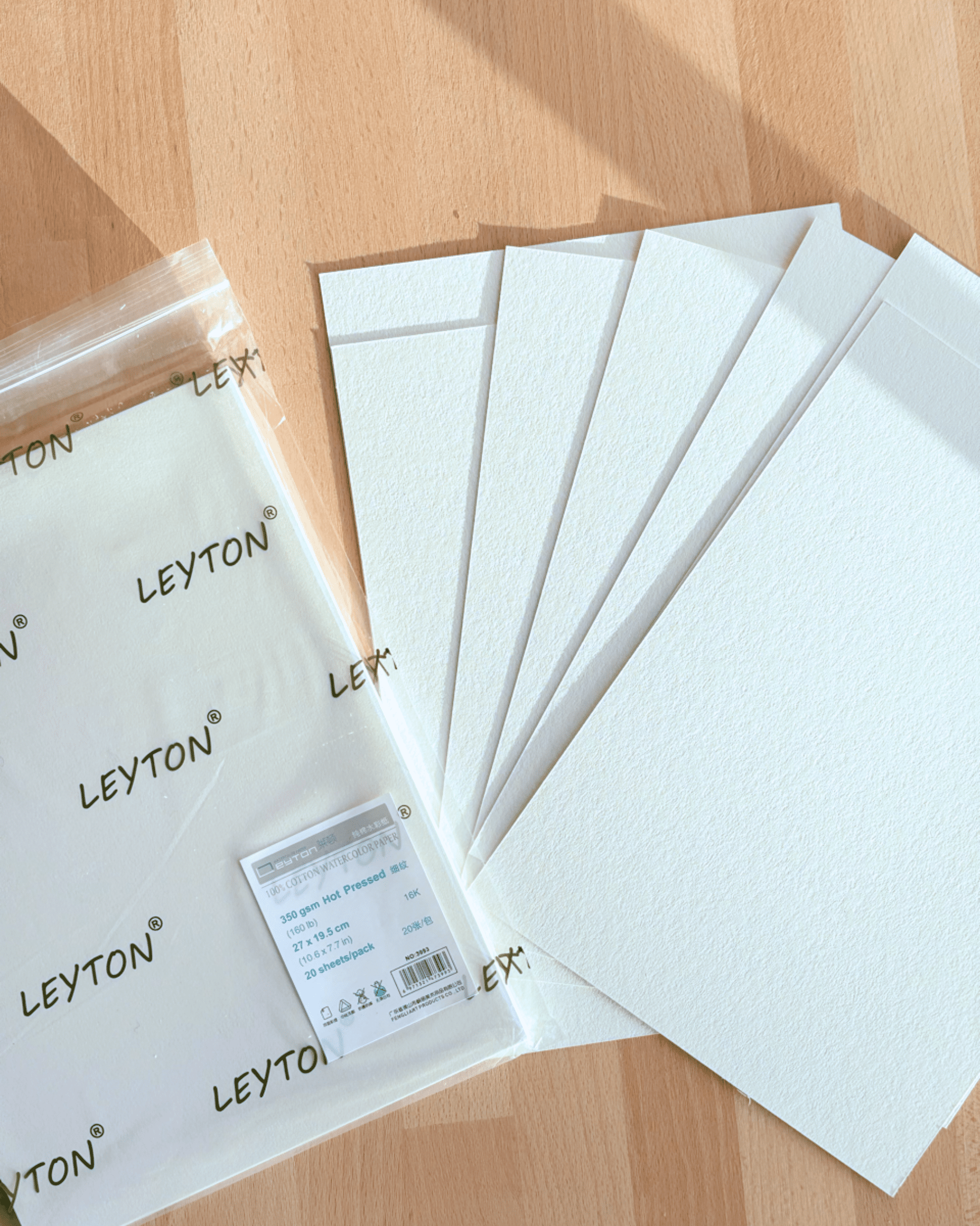 16K Sachet de papier d’aquarelle Leyton qualité artiste 100 % coton , 350g/m² (160lb) , Grain Satiné, pressé à chaud, 20 feuilles par sachet, non blanchi et sans acide, qualité artiste, se peint sur les deux faces.