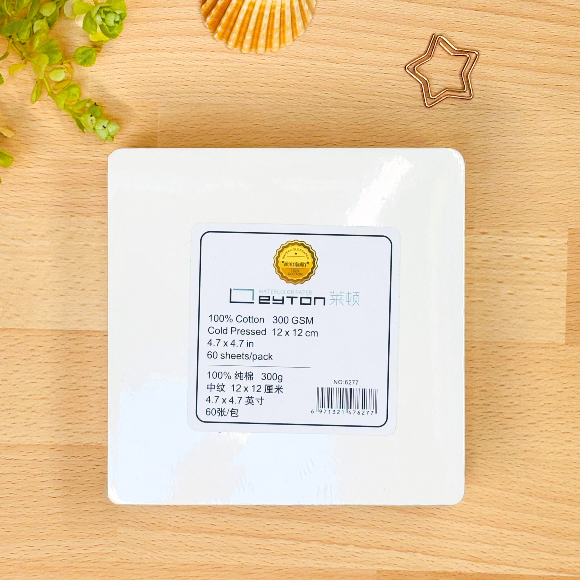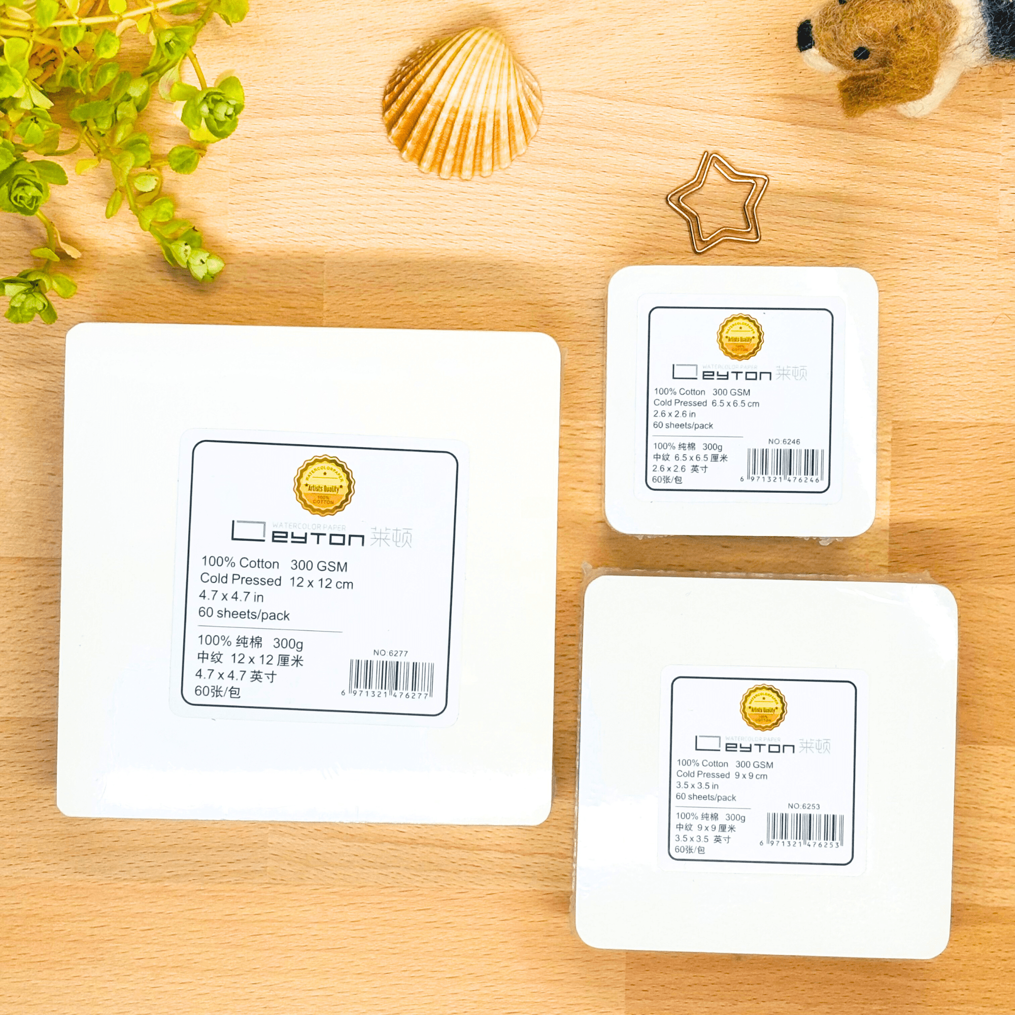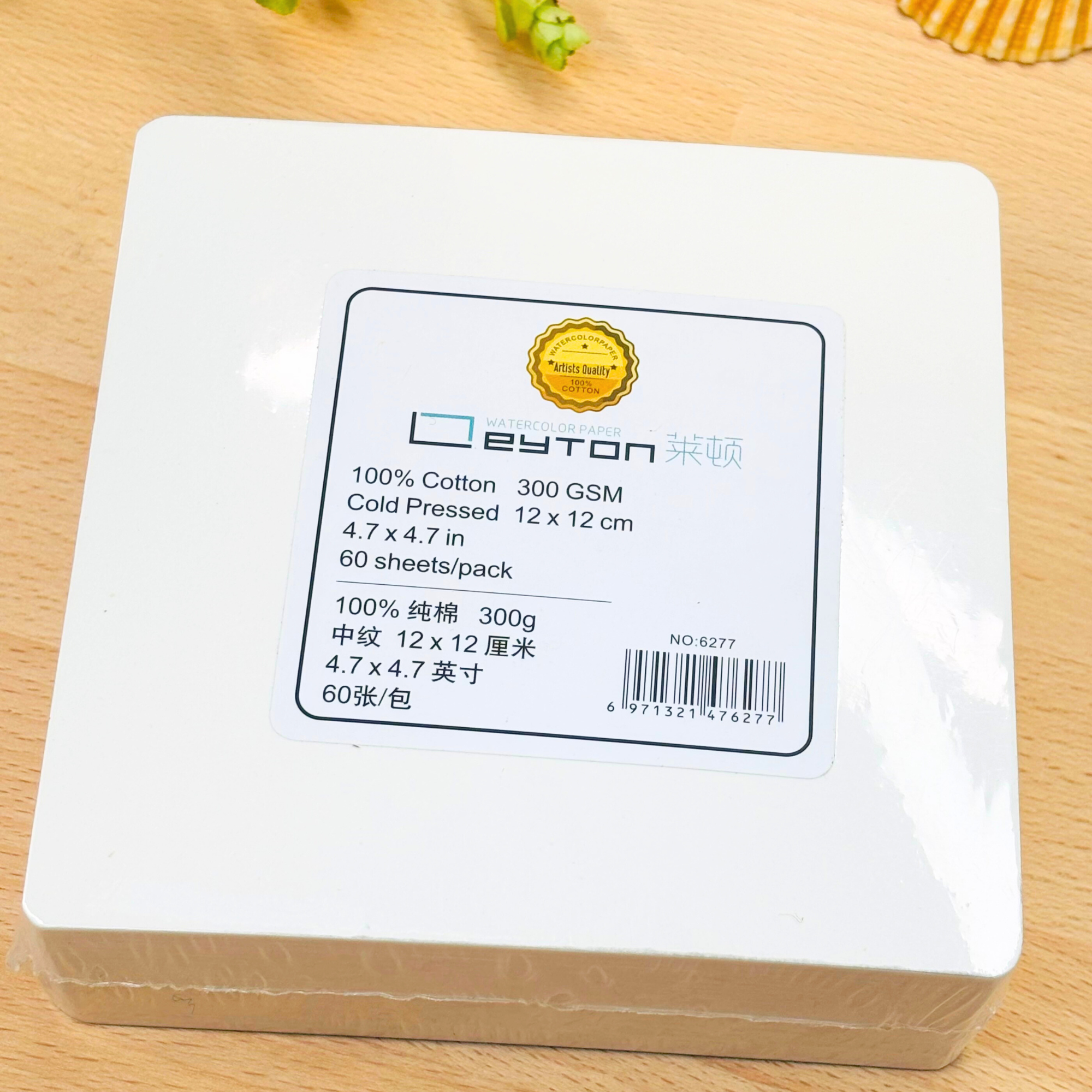 Brique carré pour aquarelle 100% coton, 300g/m² (140lb) , grain fin, pressé à froid, 60 feuilles par paquet, non blanchi et sans acide, qualité artiste, se peint sur les deux faces.