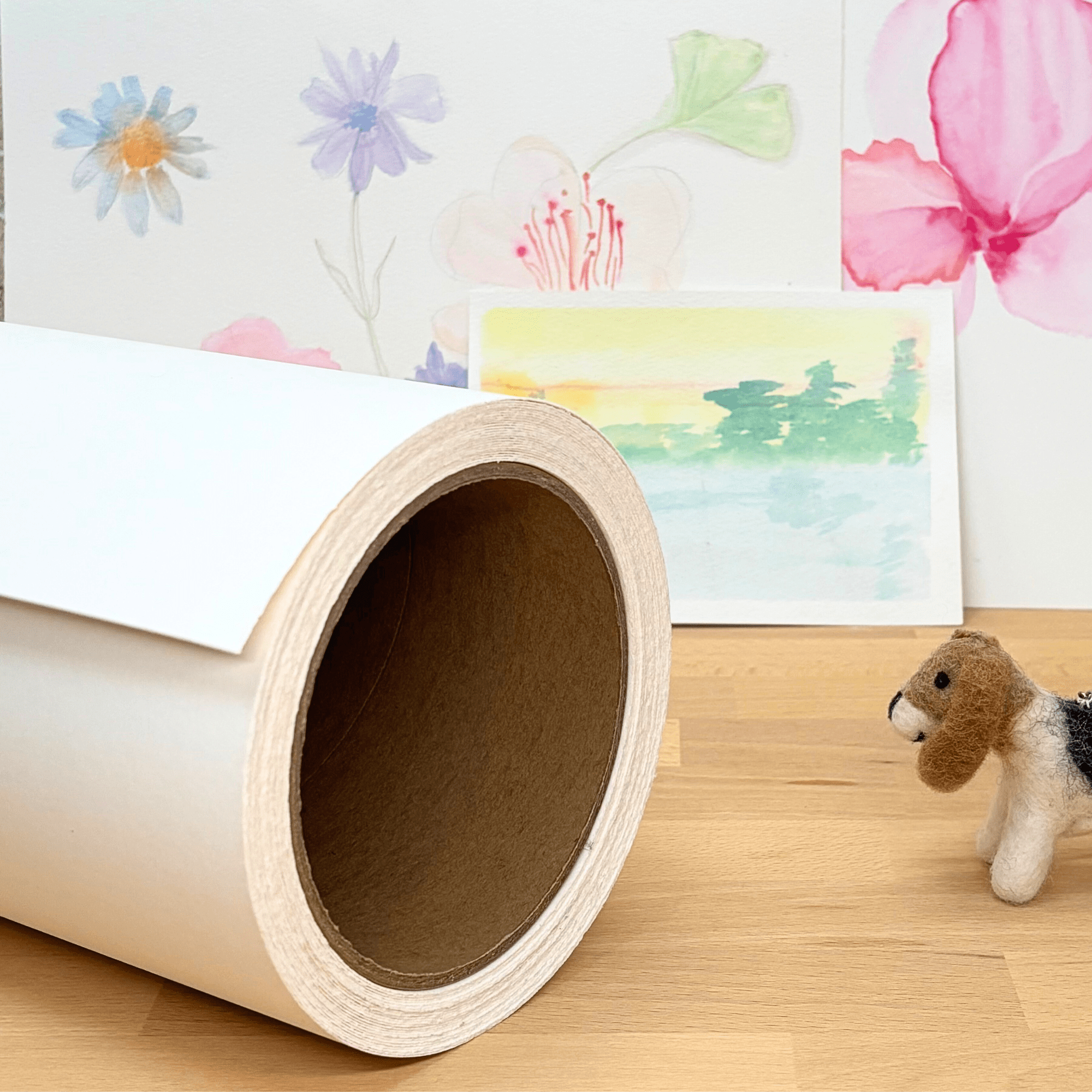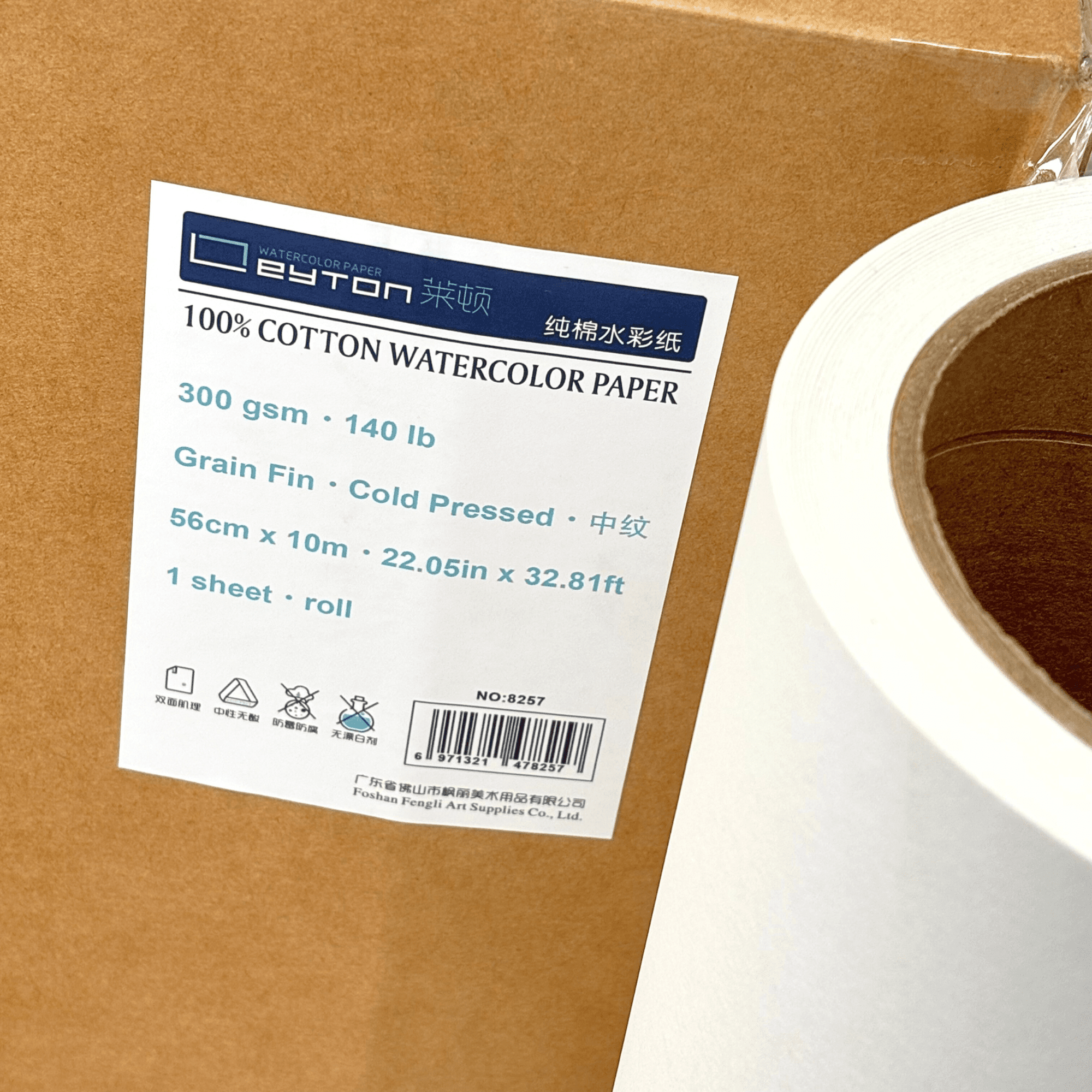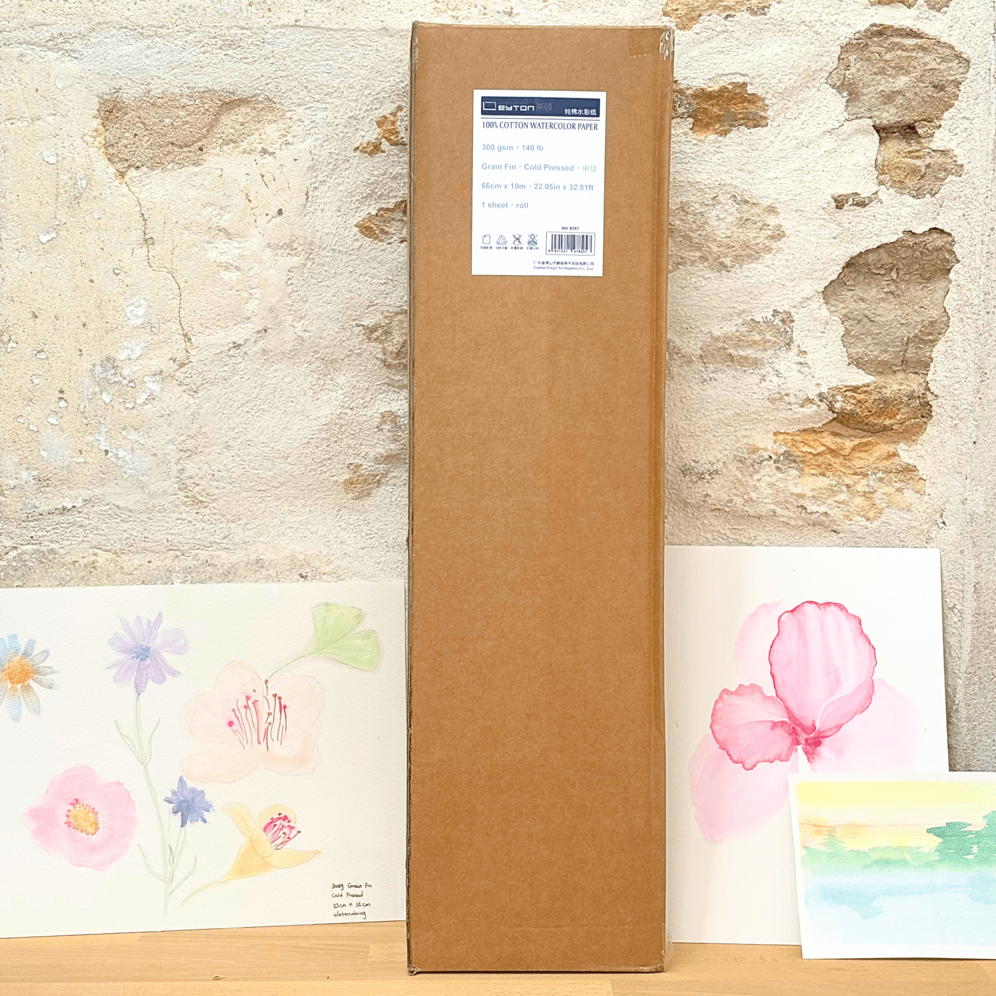 Le rouleau de papier d’aquarelle Leyton, une grande feuille de 10 mètres de long, 56cm de large, 100% coton , 300g (140lb) , Grain Fin, pressé à froid, non blanchi et sans acide, qualité artiste.