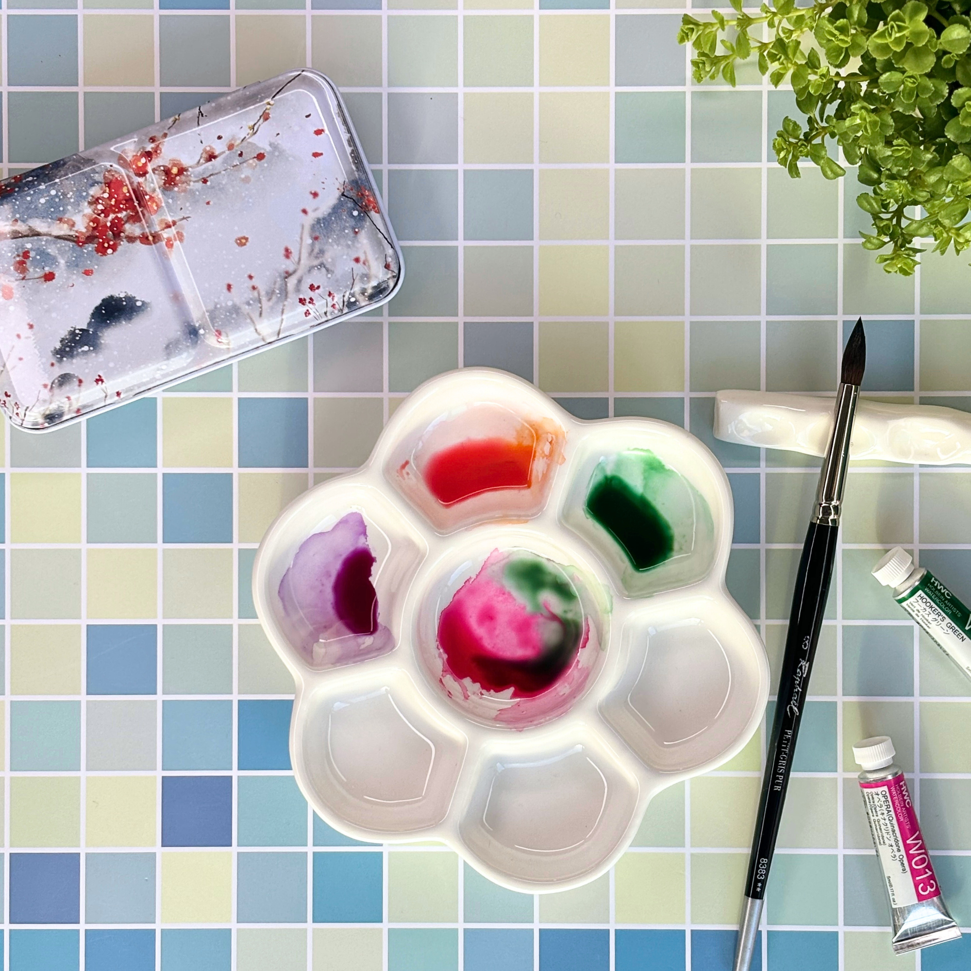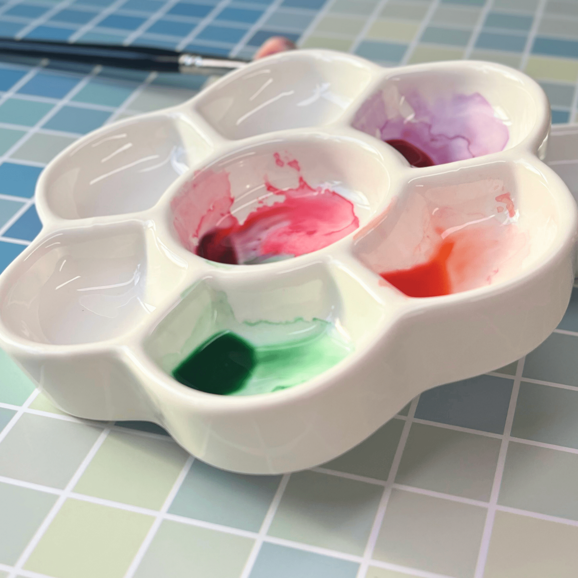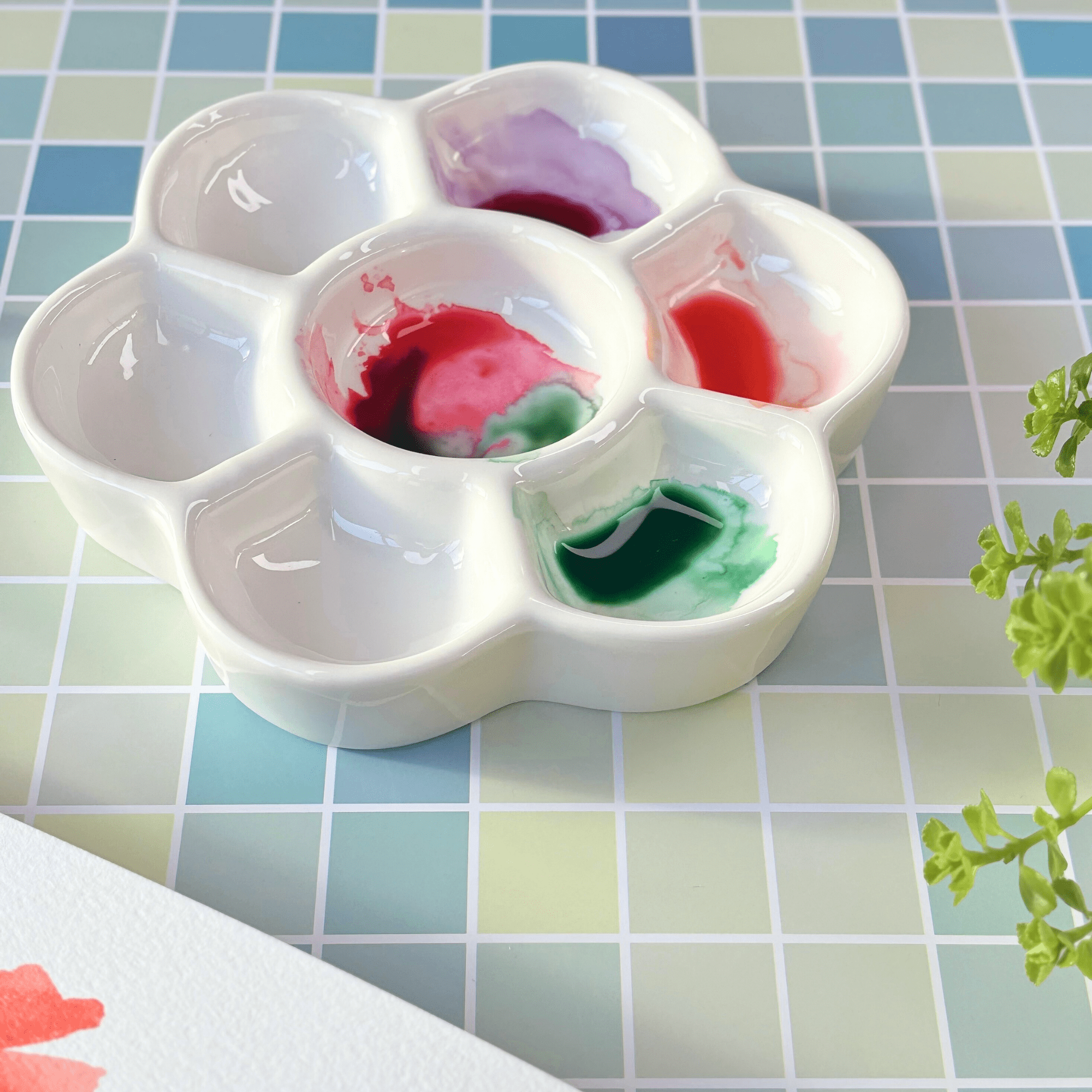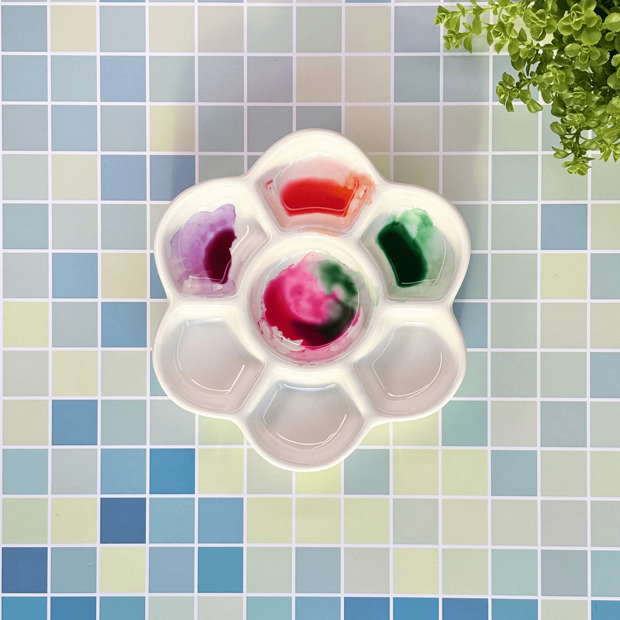 Une palette en forme de fleur avec 7 emplacements pour mélanger les couleurs.