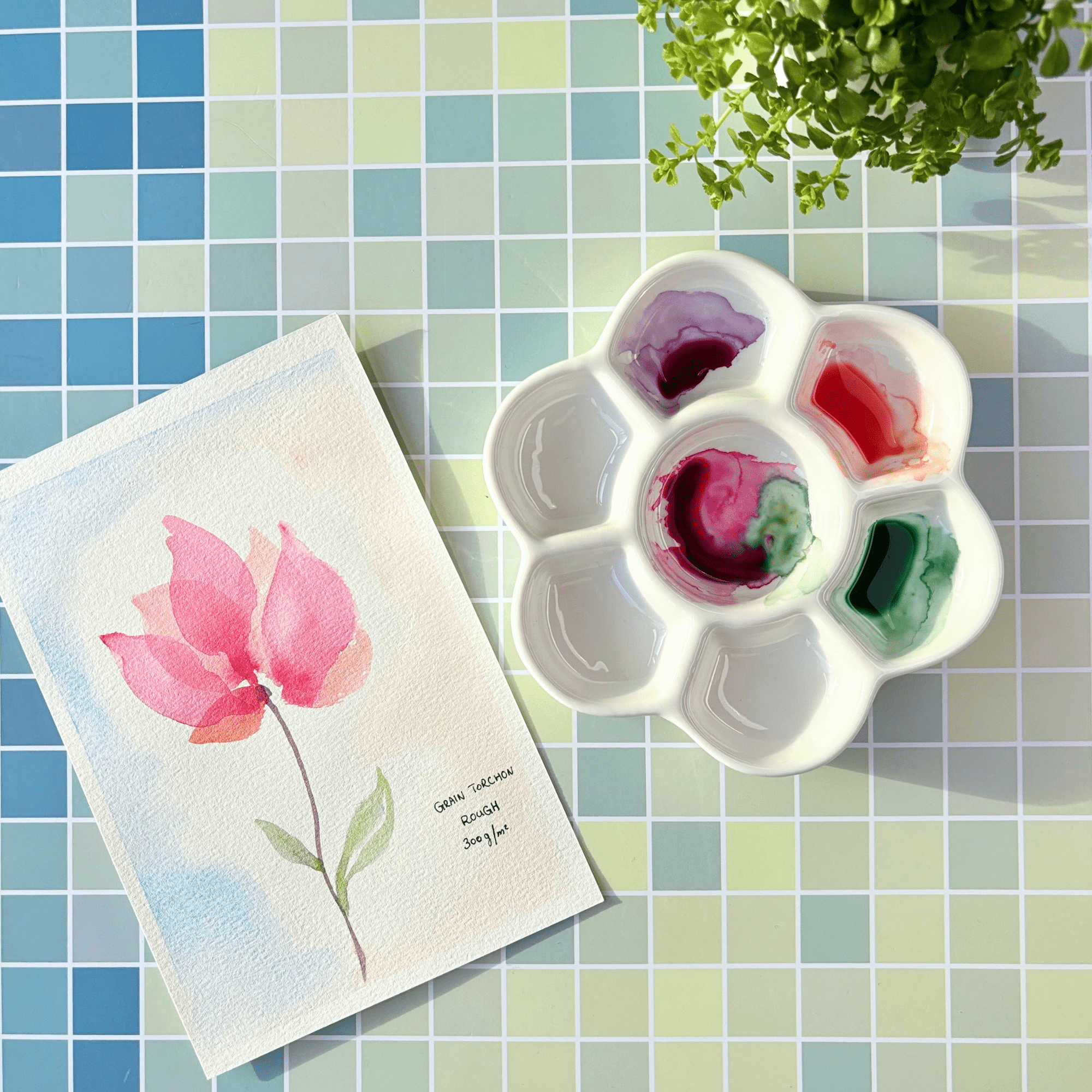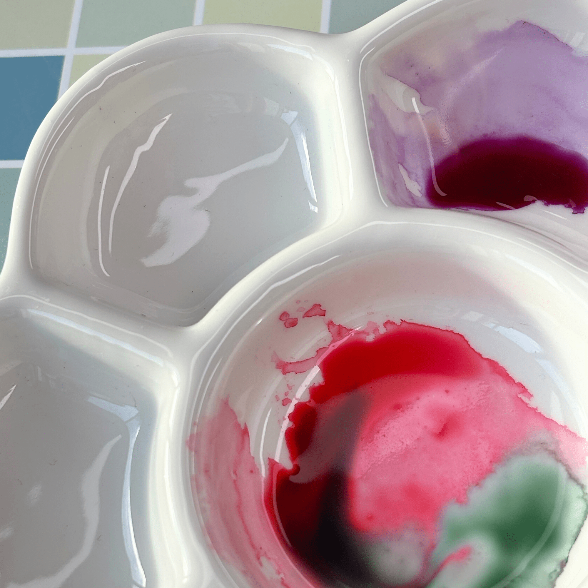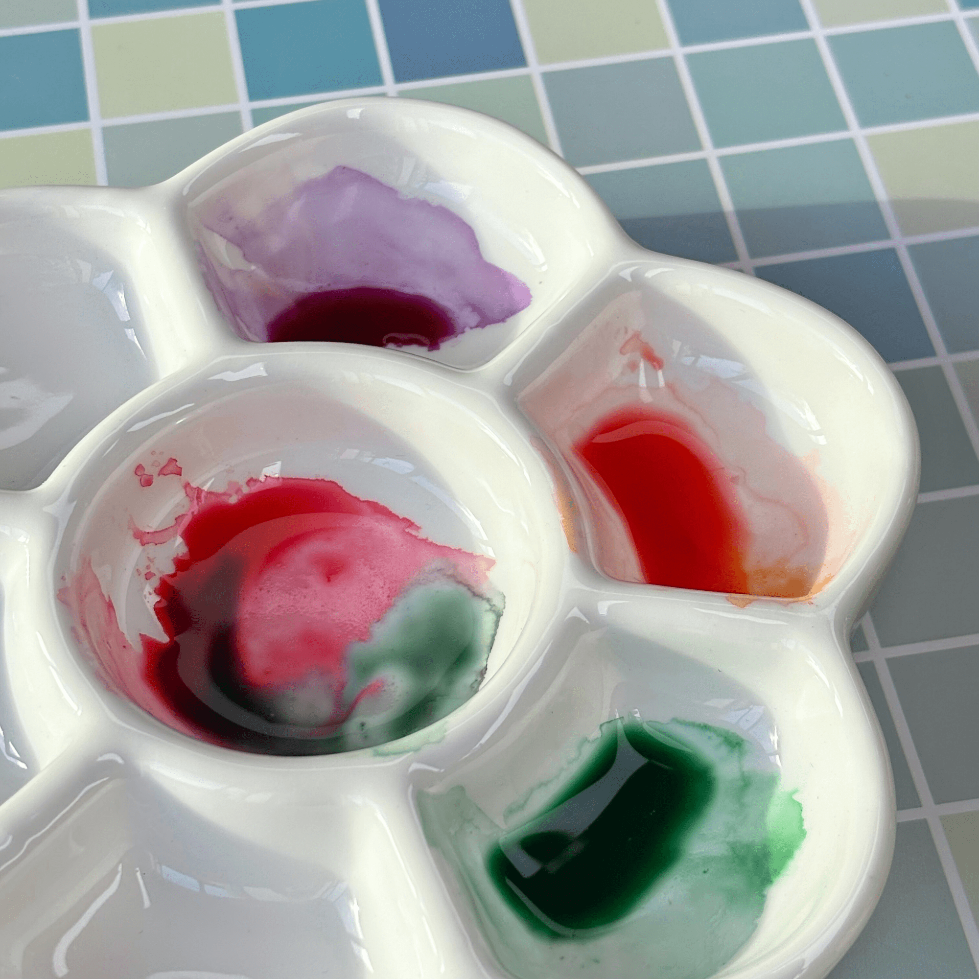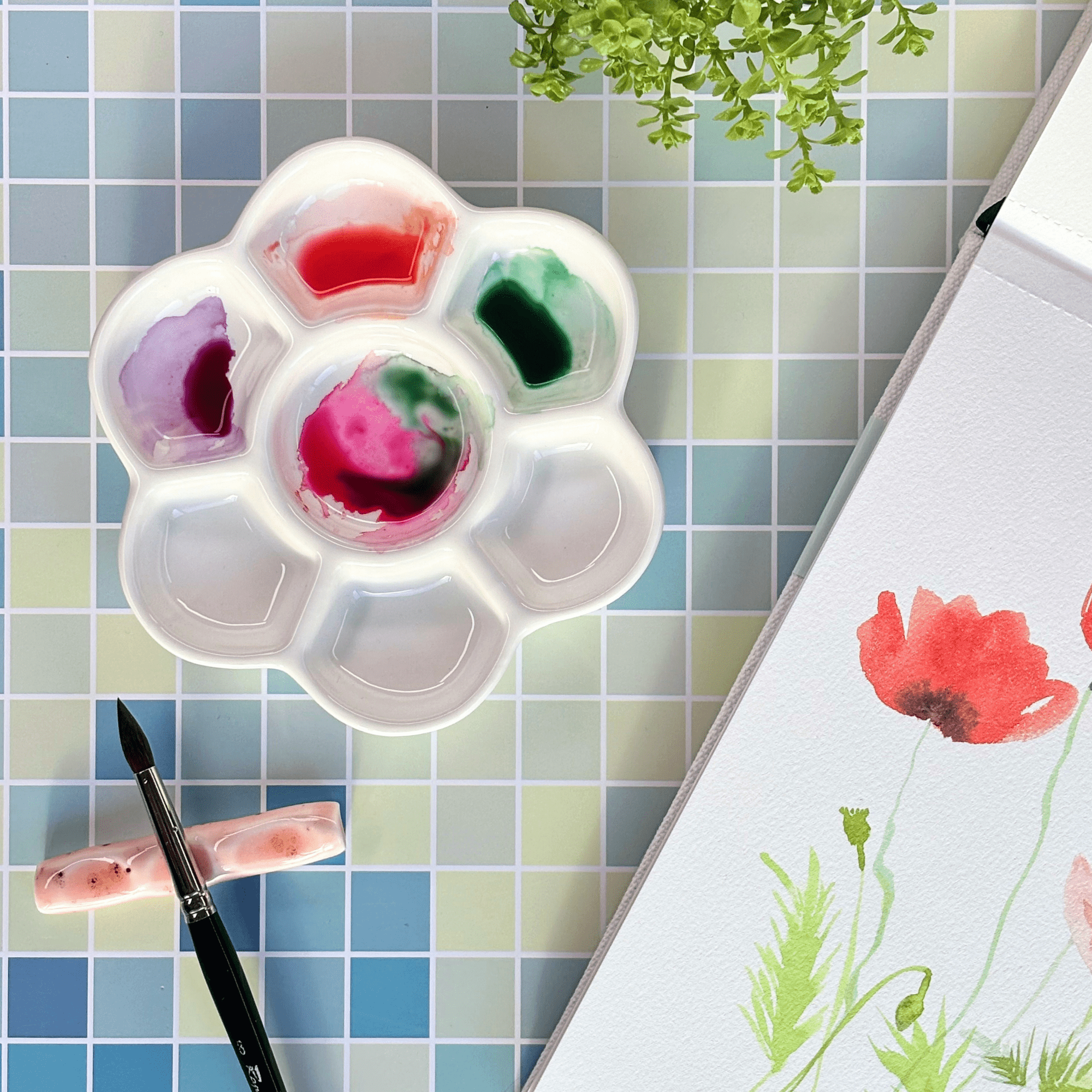 Une palette en forme de fleur avec 7 emplacements pour mélanger les couleurs.